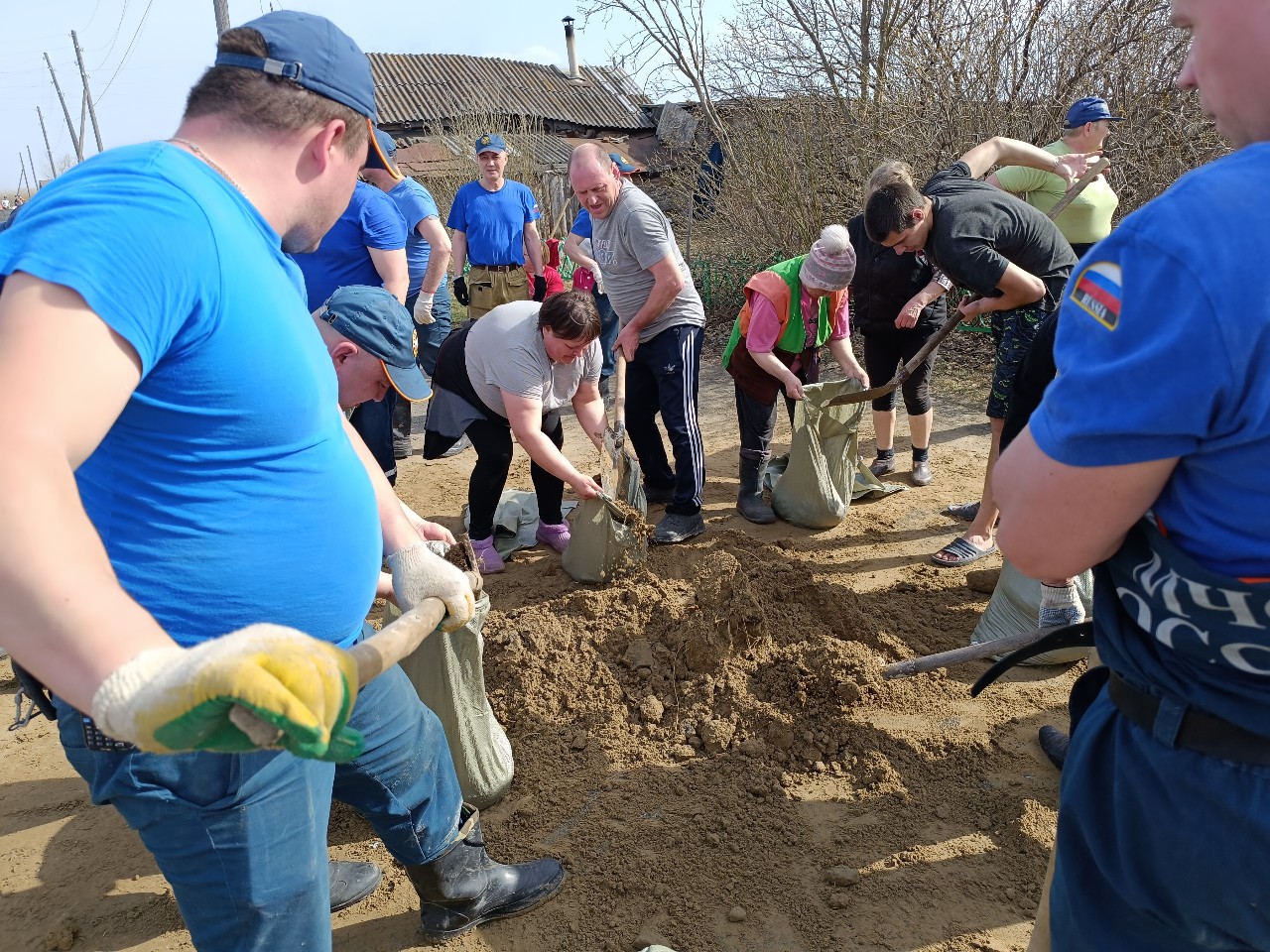 Заполнять мешки песком помогали местные жители, в основном женщины и дети 10-11 лет. Были и совсем пожилые. Деревенские быстро распределили между собой обязанности. Одни подавали мешки и веревки, другие держали горловину, чтобы быстрее их заполнять. Пожарные орудовали лопатами. Работали на жаре без передышки в едином порыве. Такой слаженной работы я давно не видел. За полтора часа от кучи с песком осталась ровная поверхность. На заполнение одного мешка уходило до минуты.