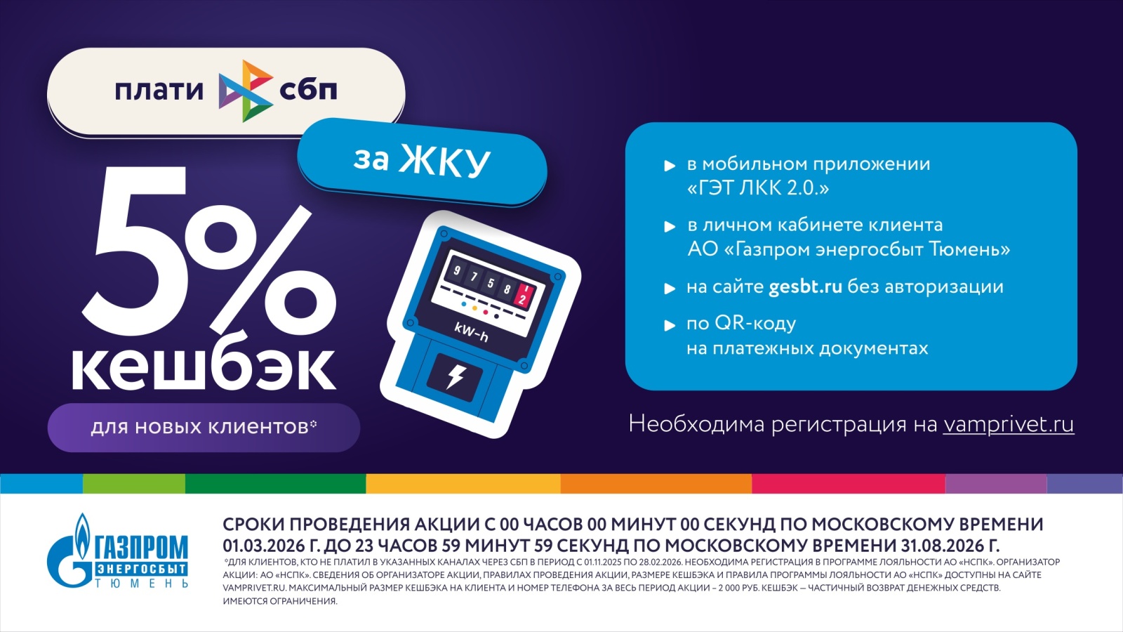 С 1 марта 2026 года клиенты АО «Газпром энергосбыт Тюмень» смогут получить кешбэк в размере 5 % при оплате жилищно-коммунальных услуг через Систему быстрых платежей (СБП).