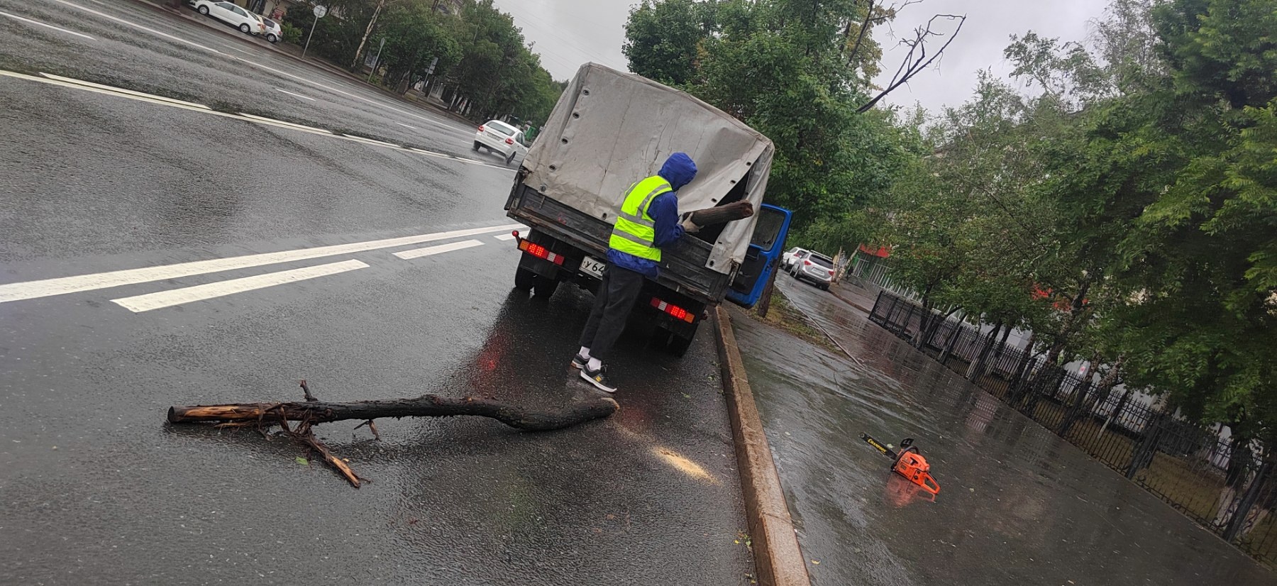 Кроме того, проводится расчистка проезжей части и тротуаров от веток и деревьев, упавших в связи с порывами ветра до 18 м/с.