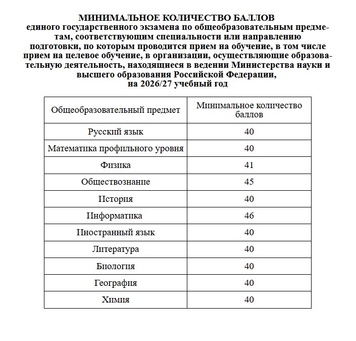 Минимальное количество баллов для поступления в вузы в 2026 году (проект):
