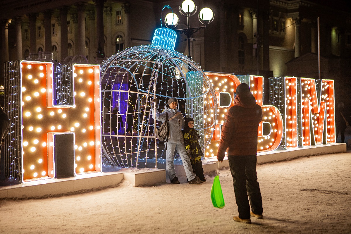 Со стороны улицы Республики на площади появилось пожелание «С Новым годом». Лампочки и светящийся новогодний шар — тоже прекрасный фон для новогодних снимков.