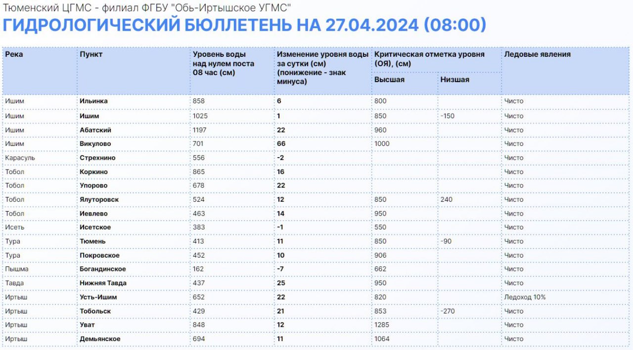 Река Ишим продолжает прибывать. К восьми утра 27 апреля уровень в районе Абатского поднялся до 1197 см, в городе Ишиме — до 1025 см, в Ильинке — до 858 см. Таковы оперативные данные с гидропостов. Информацию о критических уровнях подъема воды можно посмотреть в таблице ниже.