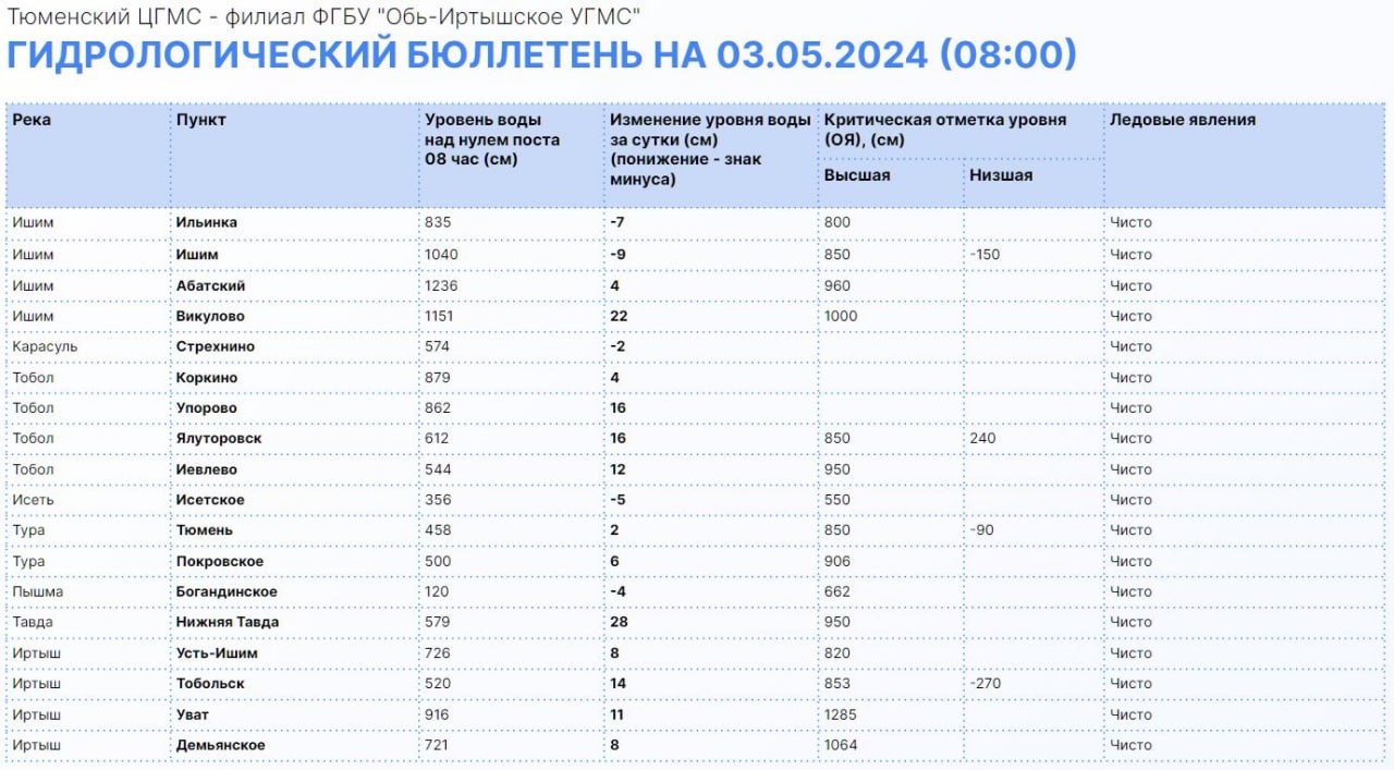 Река Ишим в селе Абатском за сутки поднялась на 4 см и к восьми утра 3 мая достигла уровня 1236 см. При этом в городе Ишиме и в районе Ильинки продолжается спад: сейчас вода на отметках 1040 и 835 см соответственно.