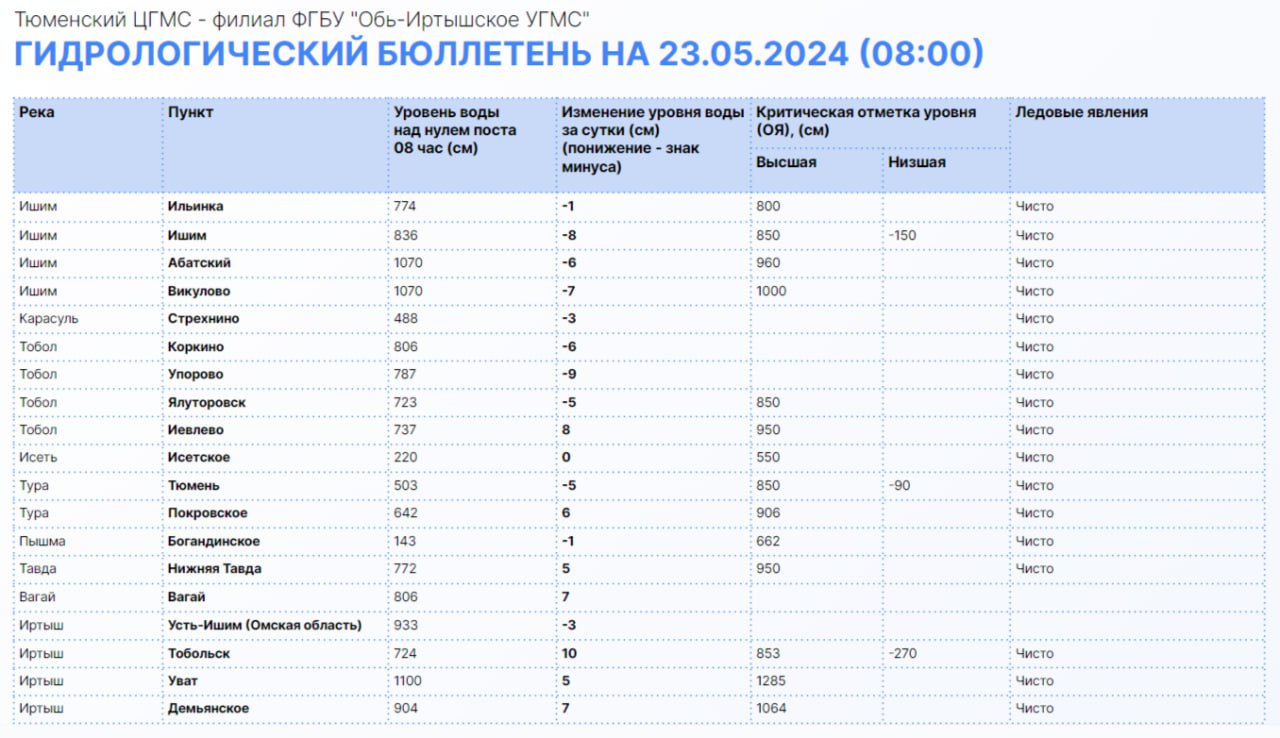 По реке Ишим продолжается снижение по руслу, в Абатском и Викулово максимальное значение — 1070, в городе Ишиме — 836 см.