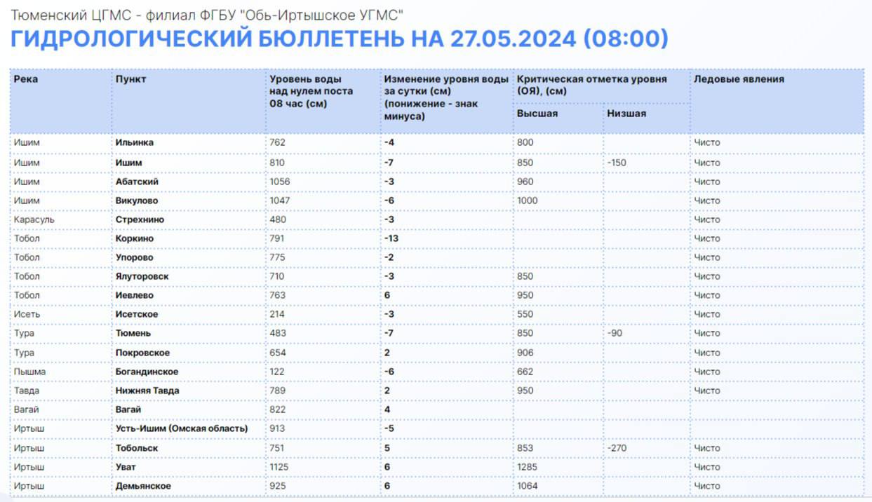Река Ишим также снижается: в одноименном городе ее уровень сейчас на отметке 810 см, в Абатском — 1056 см, в Викулово — 1047 см.