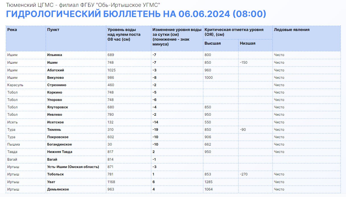 Убывают реки Ишим и Тобол. По последним данным с гидропостов, в городе Ишиме уровень достиг 748 см, в Ялуторовске — 680 см, в Упорово — 748 см, в Викулово — 986 см. Самый высокий уровень остается в Абатском — 1025 см.