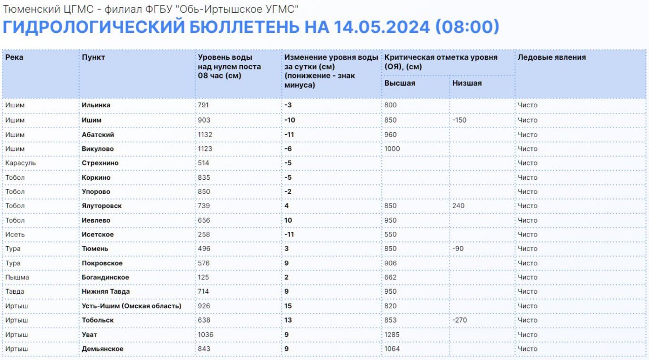 Иртыш в Увате зафиксирован на отметке 1036 см, в Тобольске — 638 см.