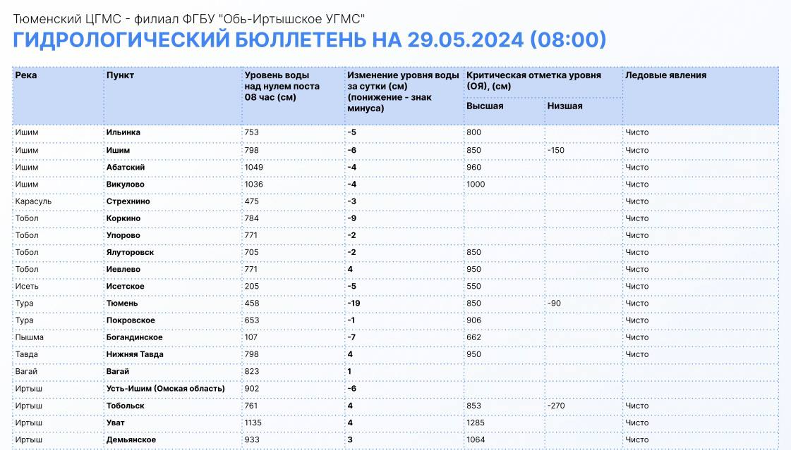 Реки Ишим и Тобол убывают. В Ялуторовске и Ишиме вода сейчас на уровне 798 и 705 см. В Абатском и Викулово уровень воды по-прежнему больше 10 метров — 1049 и 1036 см соответственно.