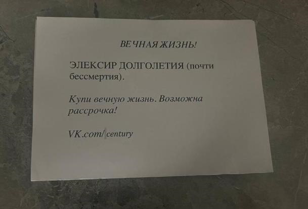 Текст объявления гласит: «Элексир долголетия (почти бессмертия). Купи вечную жизнь. Возможна рассрочка» (орфография сохранена — прим. ред.).