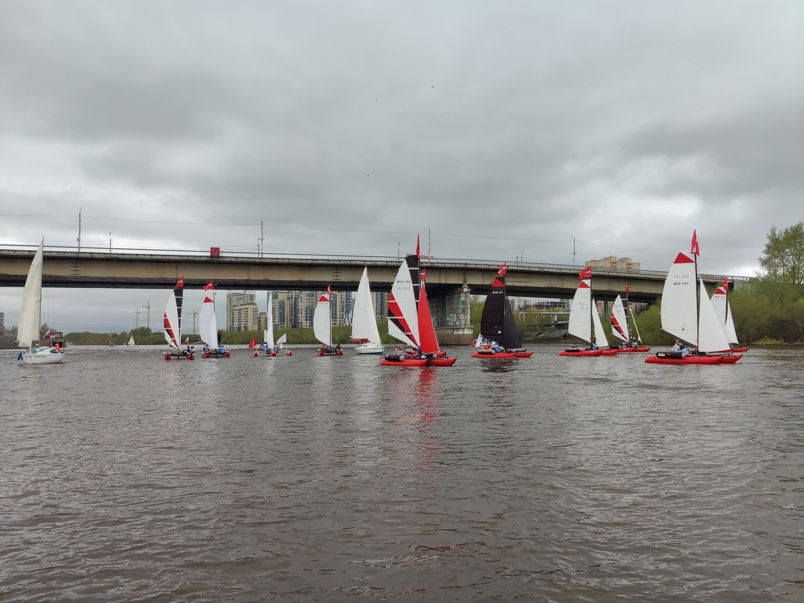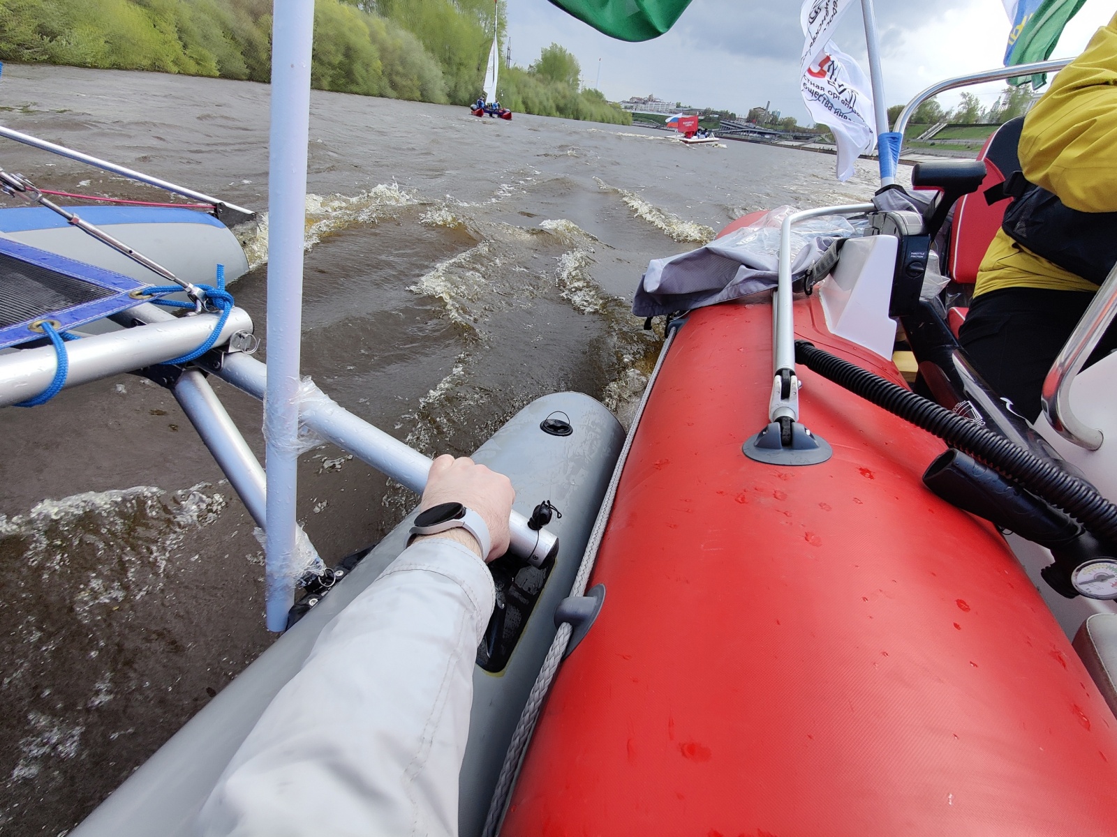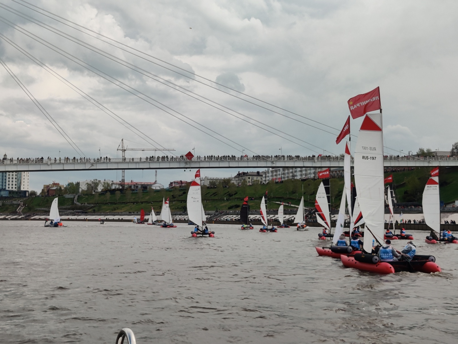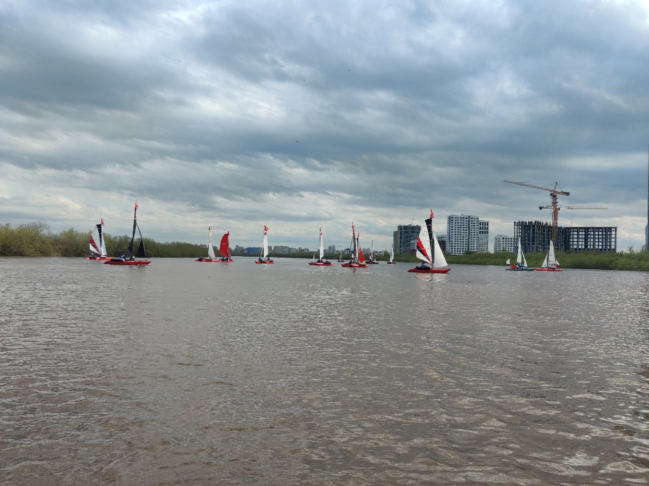 Общий сбор прошел в районе ЖК «Октябрьский», это в районе ДОК. В 11:00 на берегу стояли все плавсредства, которые через час отправятся в плавание. Час — достаточно для проведения торжественной линейки-митинга и проверки судов. Нужно убедиться, что все катамараны накачаны, лодки не дают течь, а паруса плотно принайтованы к гикам — говоря языком «сухопутных крыс», прицеплены к горизонтальной рейке, которая под прямым углом идет от мачты. Именно движение гика позволяет парусу поворачиваться к ветру тем или иным углом, чтобы лучше ловить ветер.