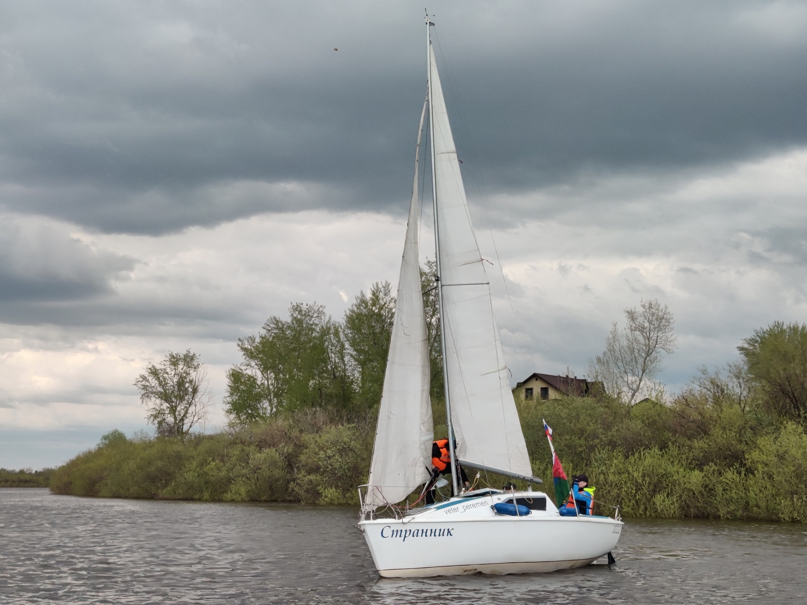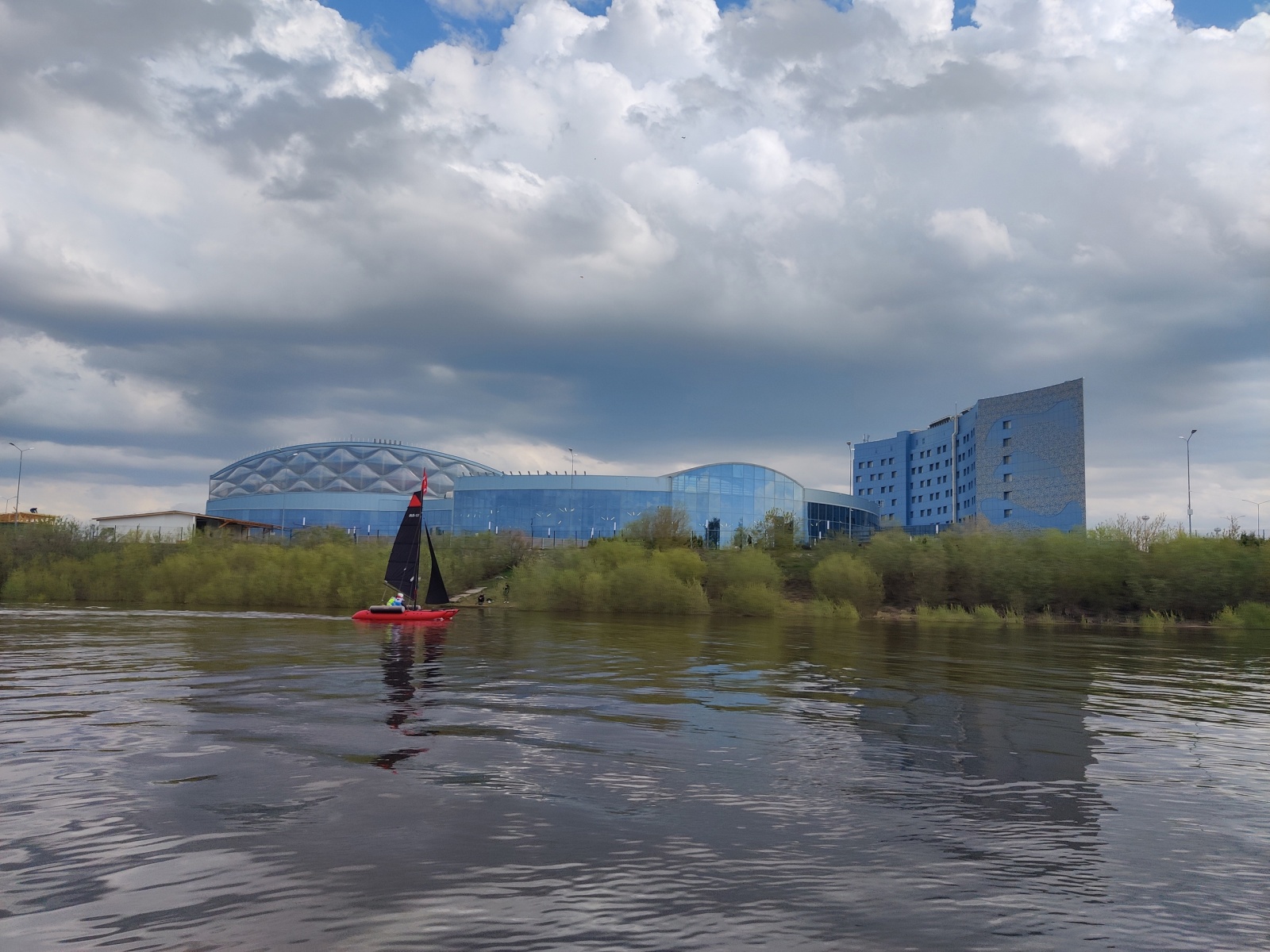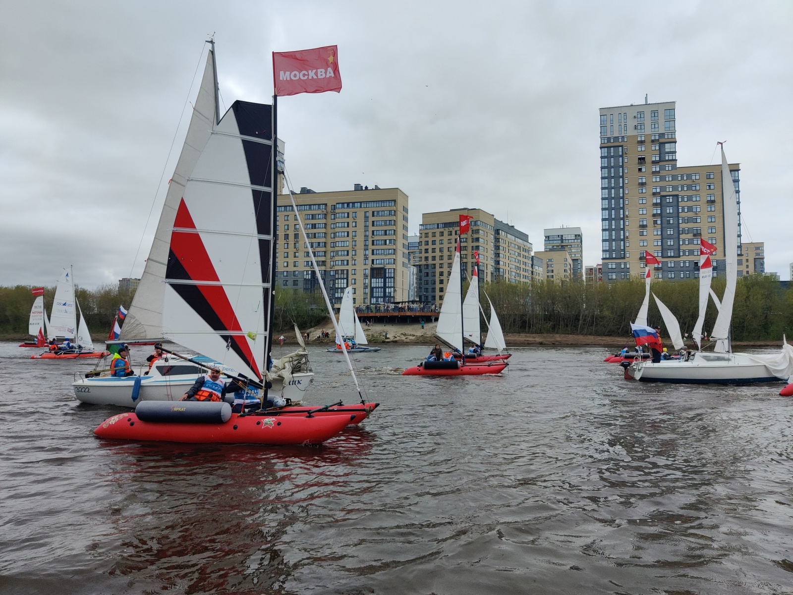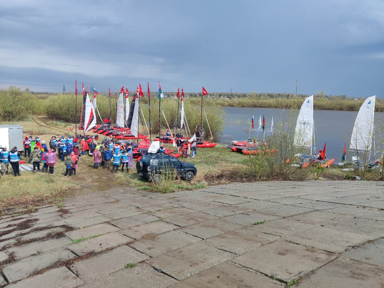 Общий сбор прошел в районе ЖК «Октябрьский», это в районе ДОК. В 11:00 на берегу стояли все плавсредства, которые через час отправятся в плавание. Час — достаточно для проведения торжественной линейки-митинга и проверки судов. Нужно убедиться, что все катамараны накачаны, лодки не дают течь, а паруса плотно принайтованы к гикам — говоря языком «сухопутных крыс», прицеплены к горизонтальной рейке, которая под прямым углом идет от мачты. Именно движение гика позволяет парусу поворачиваться к ветру тем или иным углом, чтобы лучше ловить ветер.