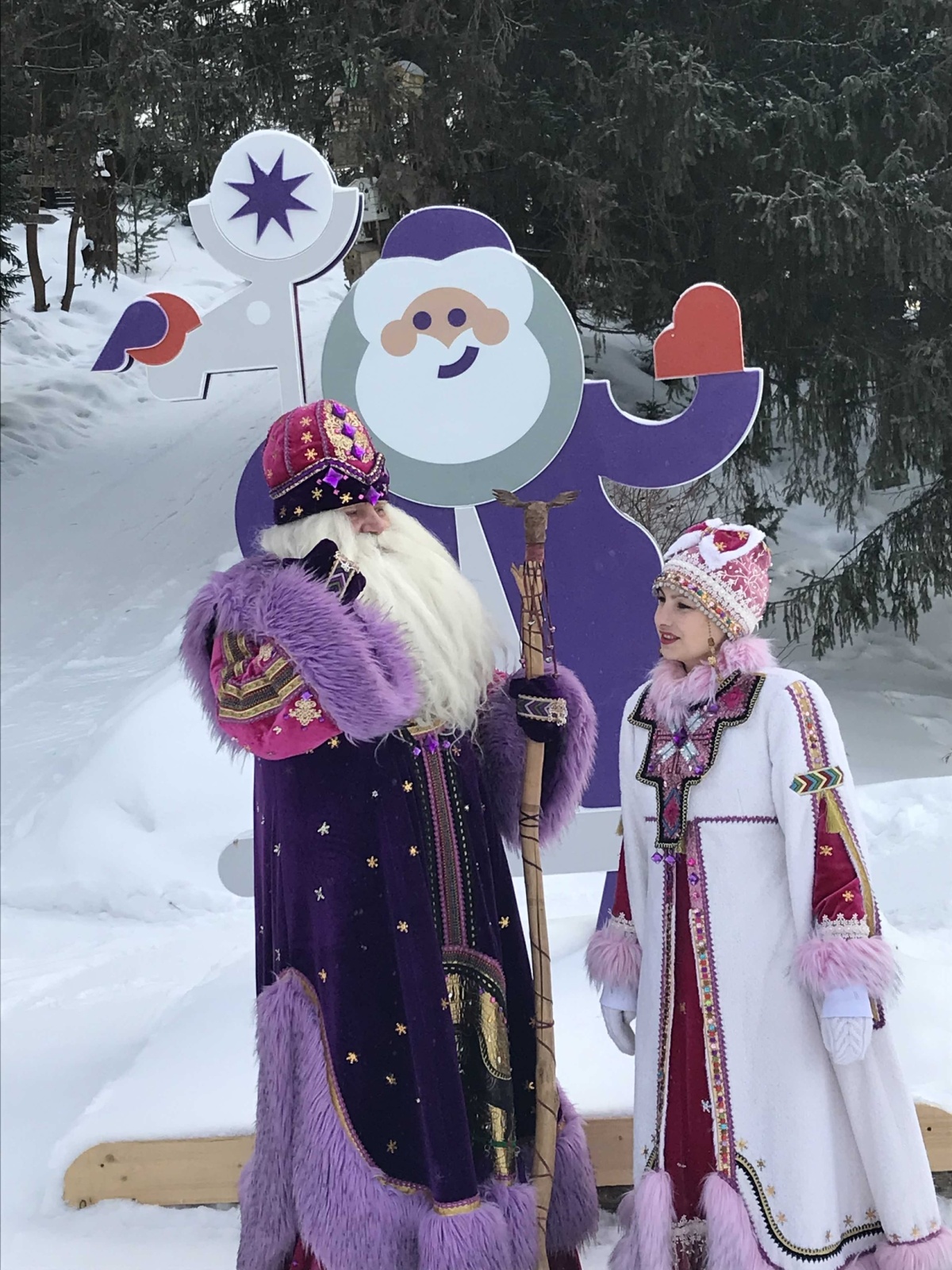 Это Дед Мороз Ямала. У него есть волшебный бубен и волшебный посох, изготовленный из дерева и украшенный изысканным орнаментом. Если прикоснуться к посоху, то загаданное желание обязательно сбудется.