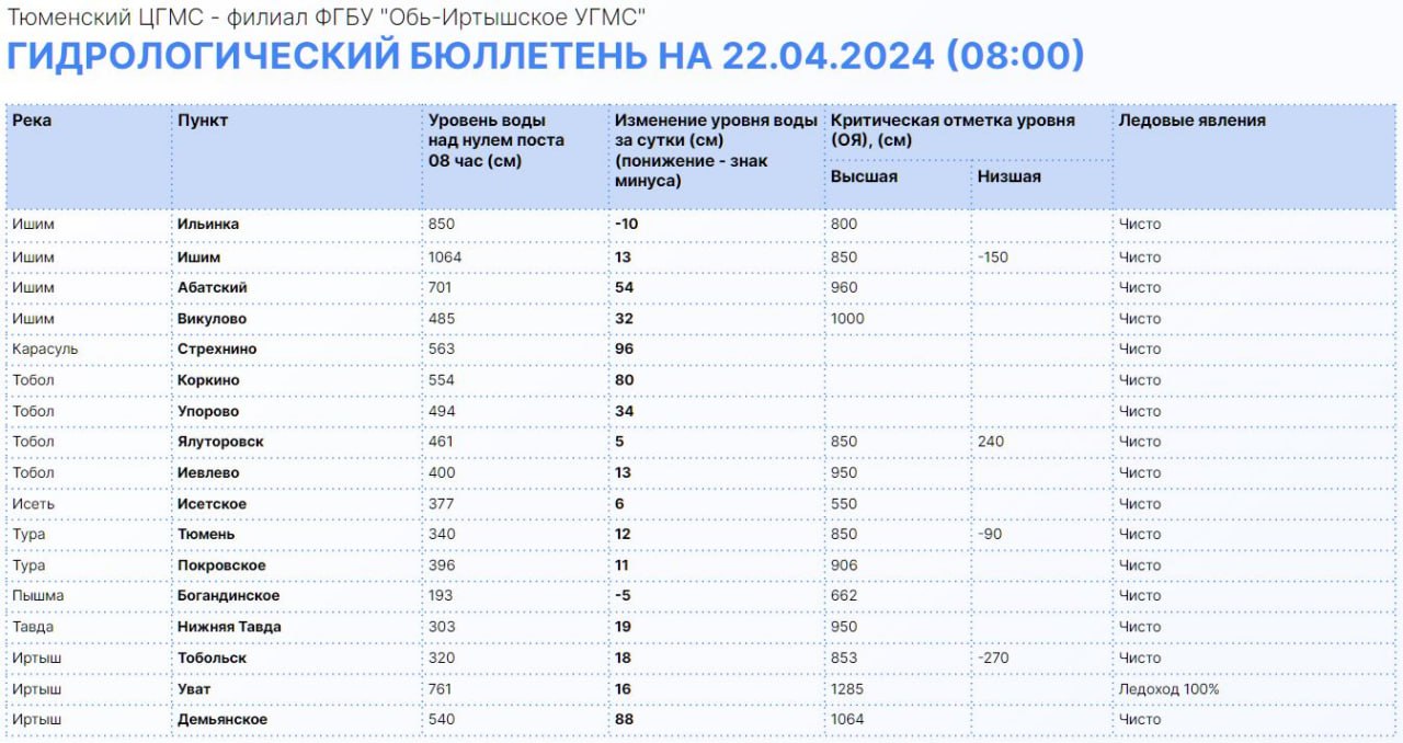 На 96 см поднялась река Карасуль в районе Стрехнино, до 563 см, на 88 см — Иртыш в районе Демьянского, сейчас его уровень составляет 540 см, в Увате — 740 см (плюс 16 см за сутки). Река Тобол в районе Коркино выросла на 80 см, зафиксирована отметка 554 см.
