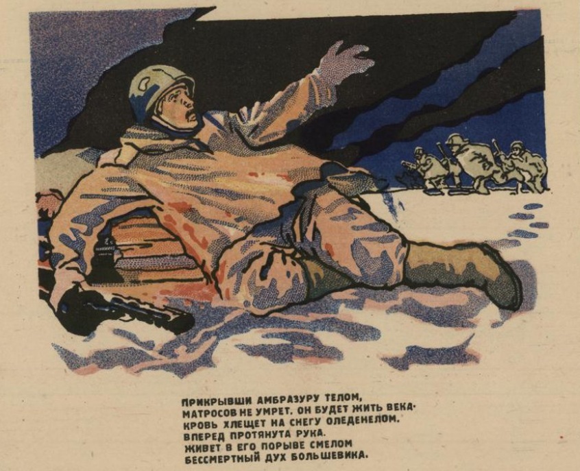 Плакат. Окно ТАСС № 830. Подвиг комсомольца Александра Матросова. Место создания СССР, г. Москва Датировка 1944 г.В донесении агитатора политотдела этой бригады старшего лейтенанта Волкова говорилось: «В бою за деревню Чернушки комсомолец Матросов 1924 года рождения совершил героический поступок — закрыл амбразуру ДЗОТа своим телом, чем обеспечил продвижение наших стрелков вперед. Чернушки взяты. Наступление продолжается. Подробности доложу по возвращении».