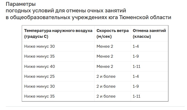 Как выяснил «Вслух.ру», в регионе параметры для актировки сохранены, они зависят от скорости ветра. Если скорость превысит 2 м/с, то при -25 градусов отменят очные занятия для учеников 1-4 классов, при -30 градусов — 5-9 классов, при -35 градусов — 10-11 классов. При безветрии — при -30, -35 и -40 градусов соответственно.