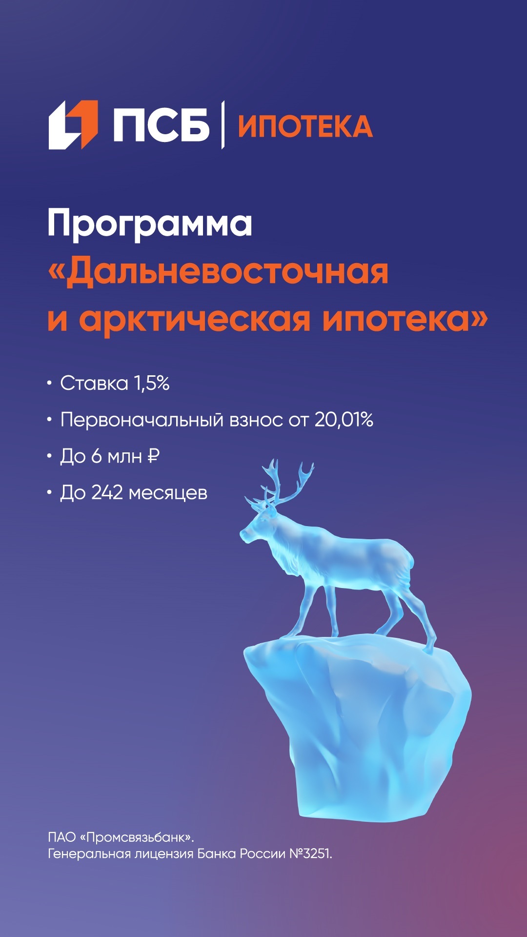 ПСБ принимает заявки на ипотеку по ставке 1,5% годовых на покупку строящегося и готового жилья у застройщиков на территории Арктической зоны России — в Мурманской области, Ненецком, Ямало-Ненецком и Чукотском автономных округах, а также на части территории Архангельской области, республик Коми, Карелии, Саха (Якутия) и Красноярского края.