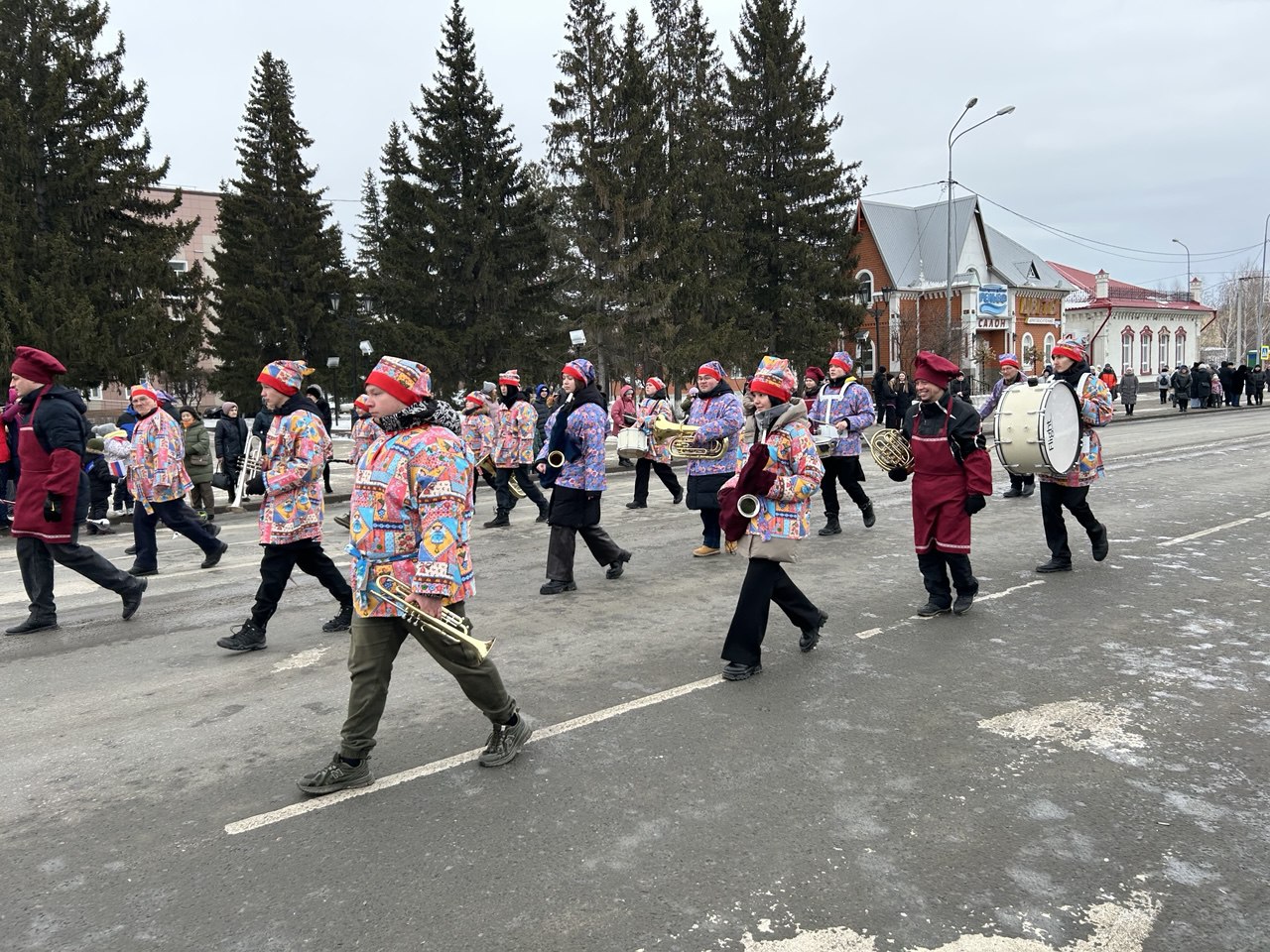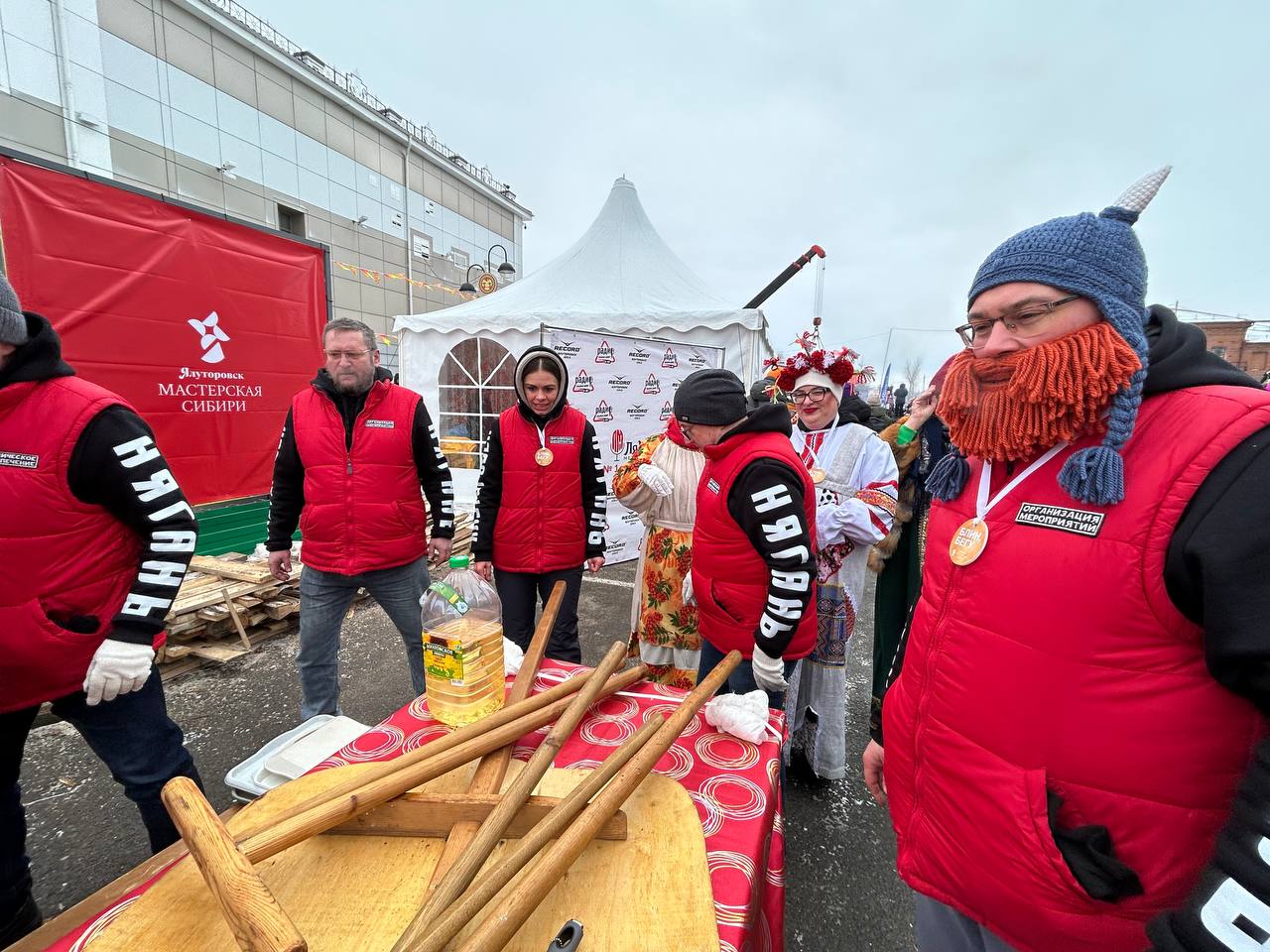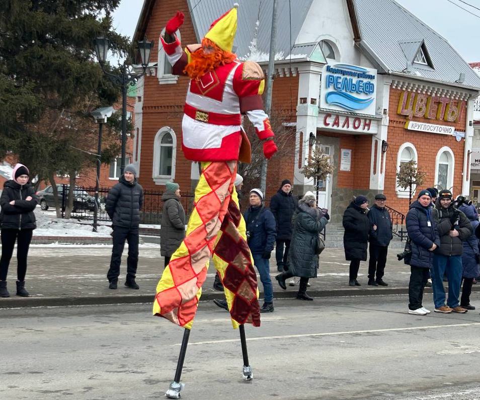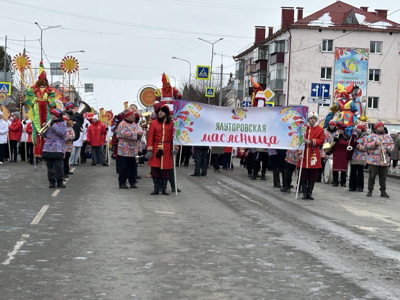 Завершающий день масленичной недели ялуторовчане начали праздничным шествием во главе с Блинным королем, Алёной-Маслёной, и тещей Ларой. Колонна под марш оркестра стартовала от местного кинотеатра «Юбилейный». В ней шагали команды блинопеков, скоморохи, ряженые, ходулисты и обычные горожане. Финишировали они через 700 метров у двух гигантских сковород по 3 метра диаметром каждая, которые уже разогрели на огромных кострах.