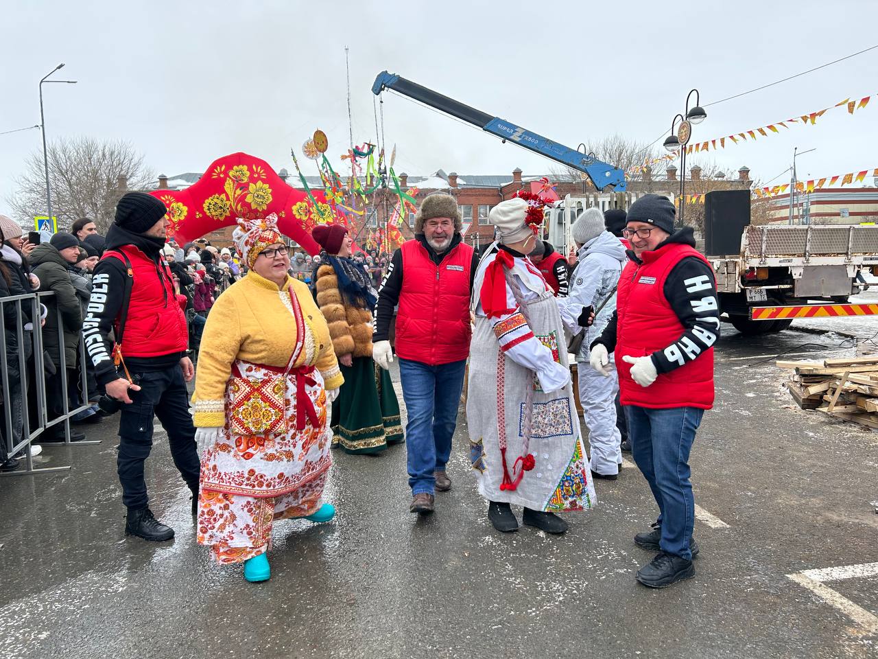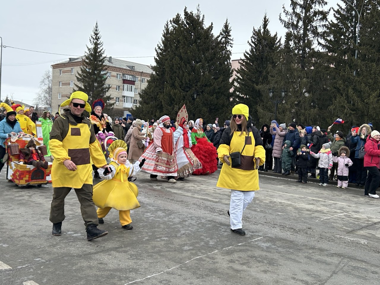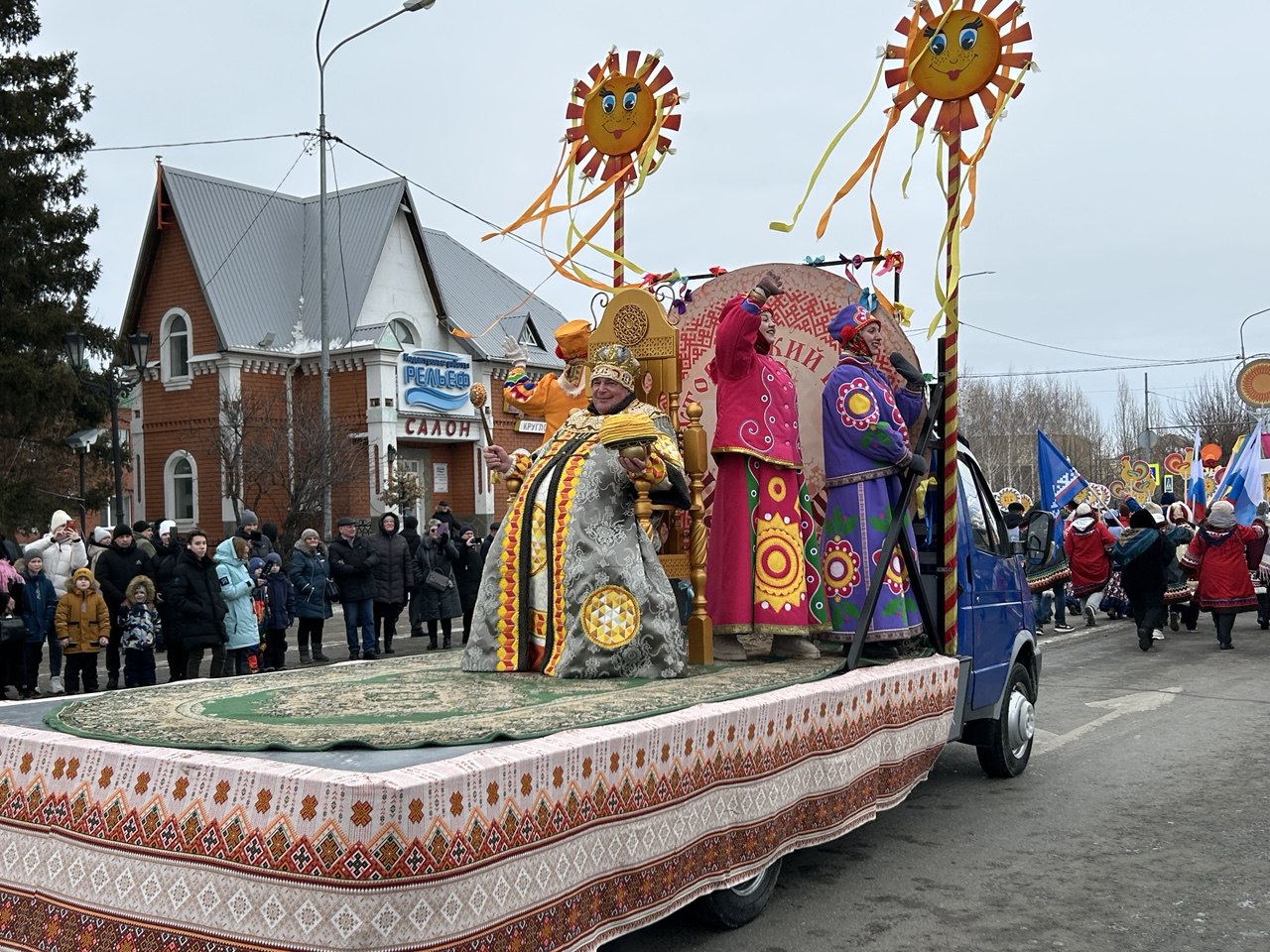 Завершающий день масленичной недели ялуторовчане начали праздничным шествием во главе с Блинным королем, Алёной-Маслёной, и тещей Ларой. Колонна под марш оркестра стартовала от местного кинотеатра «Юбилейный». В ней шагали команды блинопеков, скоморохи, ряженые, ходулисты и обычные горожане. Финишировали они через 700 метров у двух гигантских сковород по 3 метра диаметром каждая, которые уже разогрели на огромных кострах.