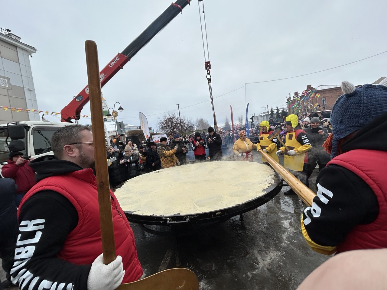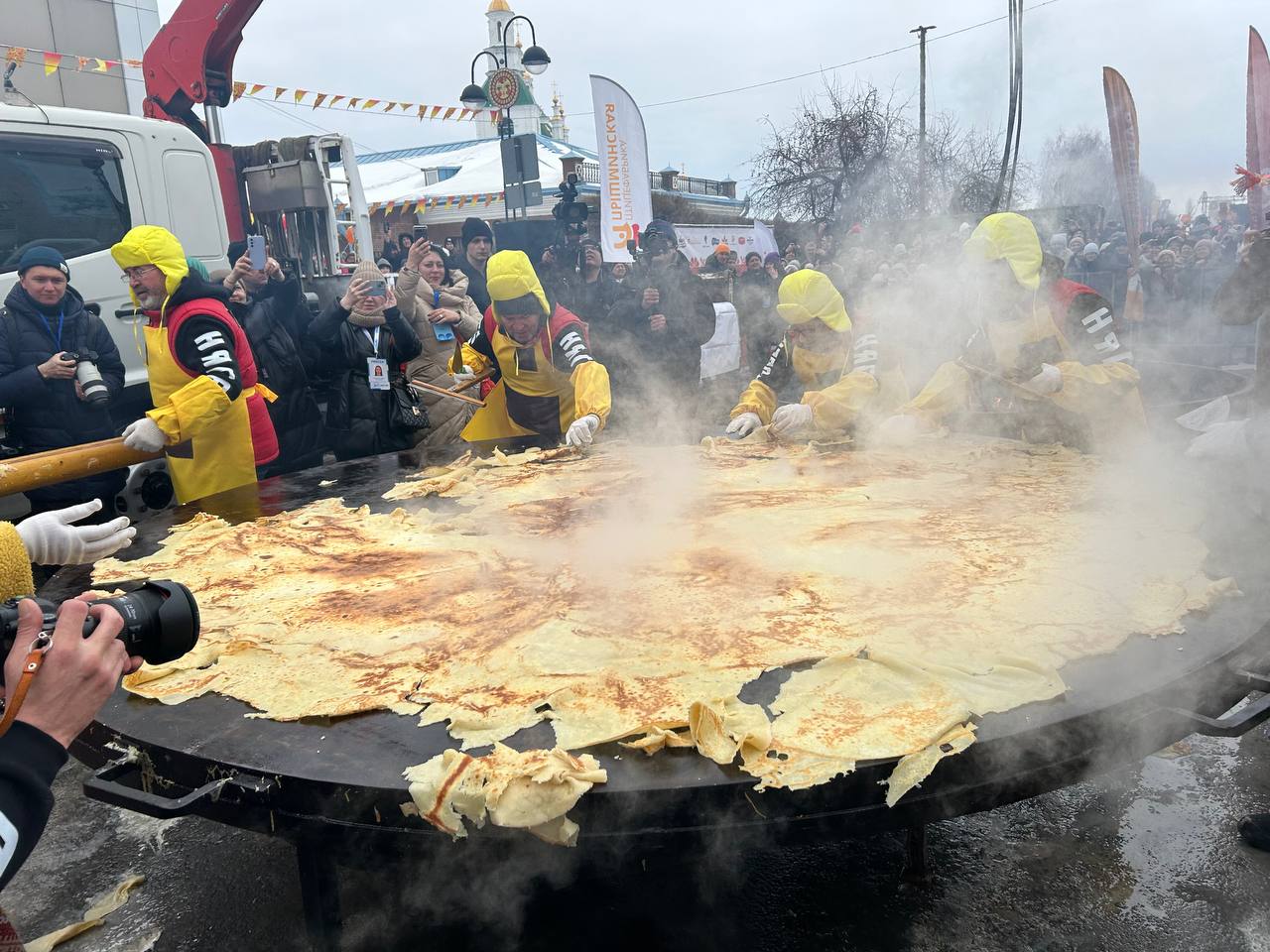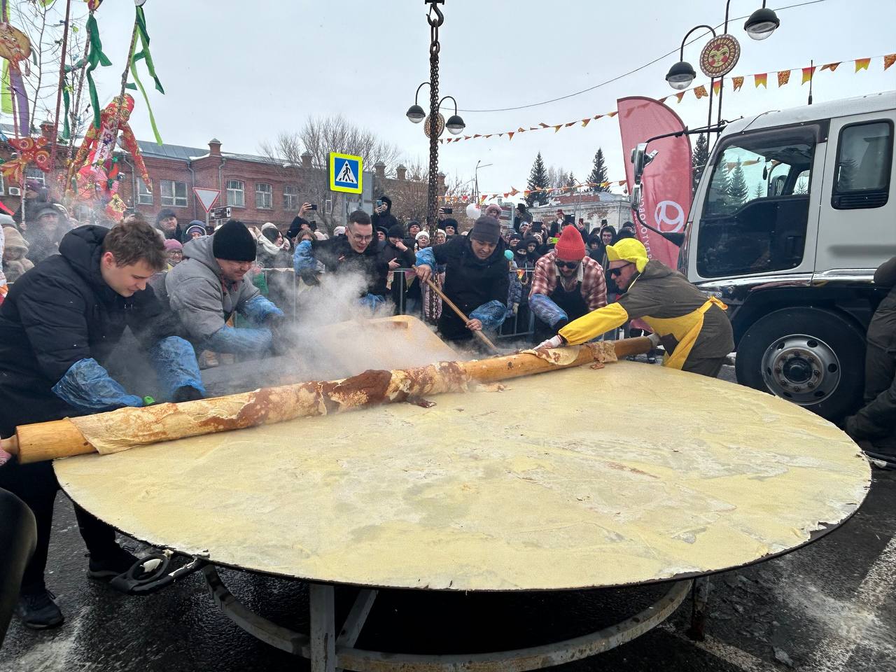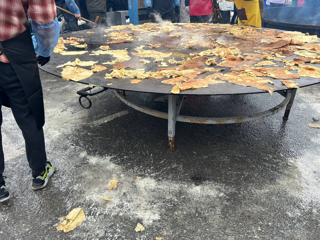 На этом моменте стоит вспомнить, что технология переворачивания гигантских блинов вырабатывалась долго и сложно, а потом отрабатывалась годами! Первый блин на гигантской сковородке пекли в 2007 году — тогда он получился комом. Пробовали использовать огромные лопаты, железные щиты — и в итоге придумали огромную скалку. Впервые блин без серьезных потерь смогли перевернуть в 2020-м, и только в 2022-м пришли к идеальному результату.