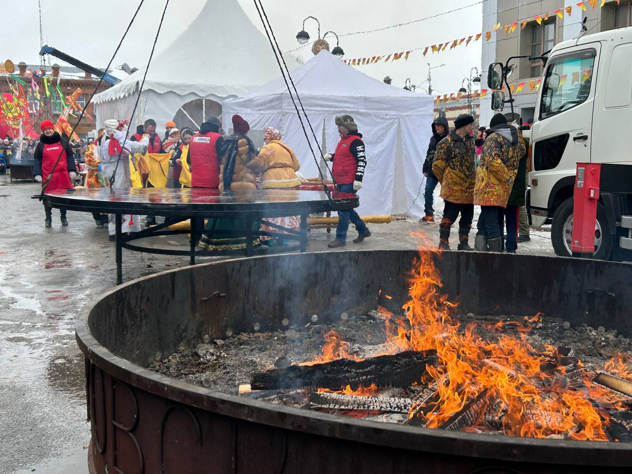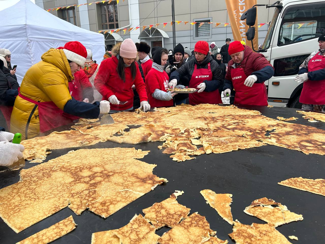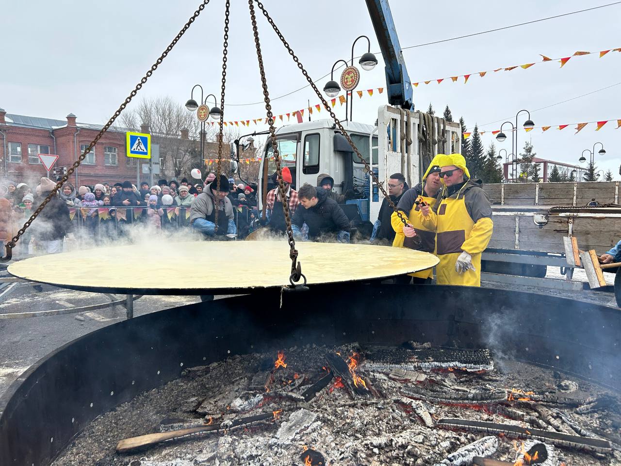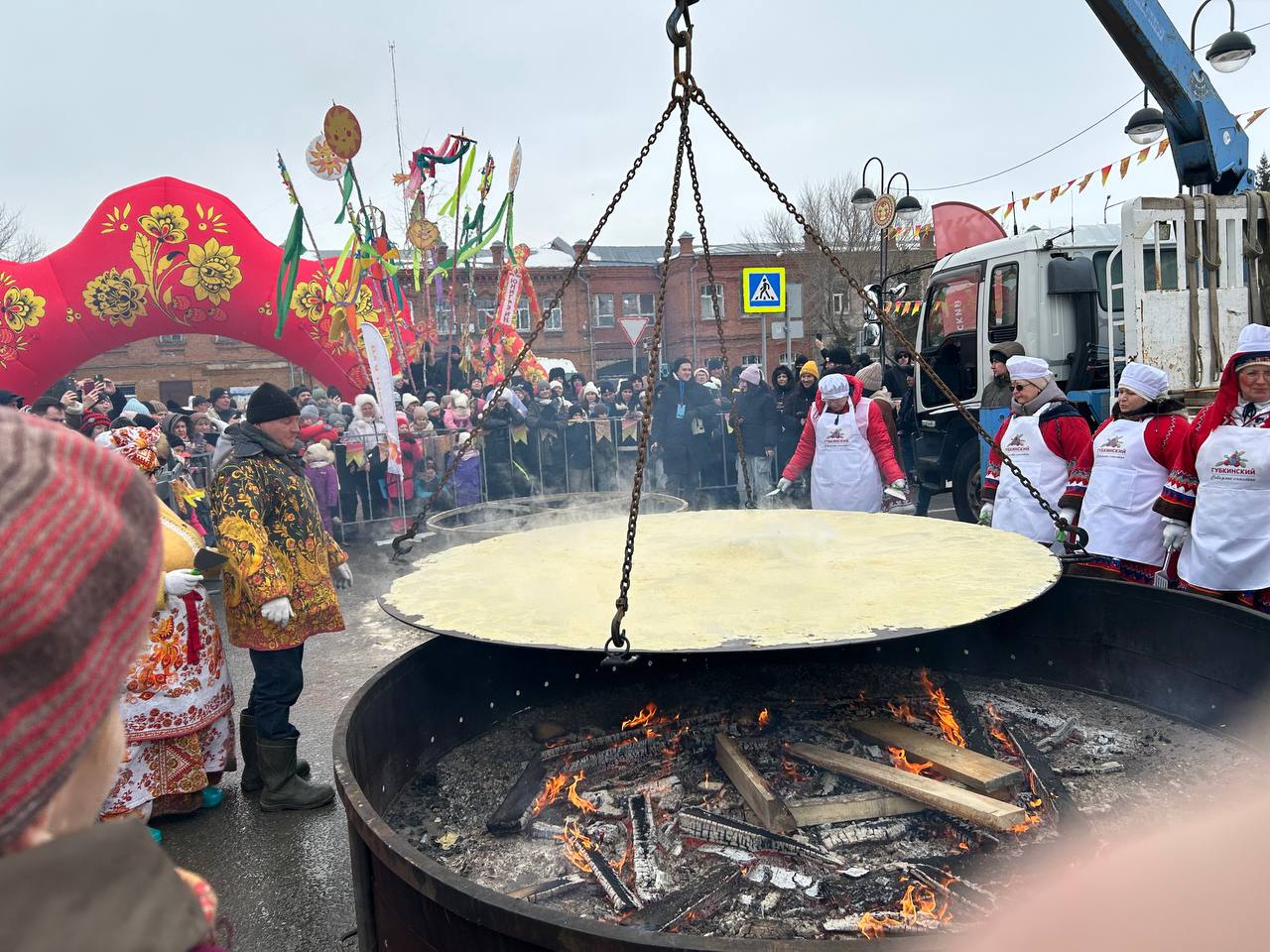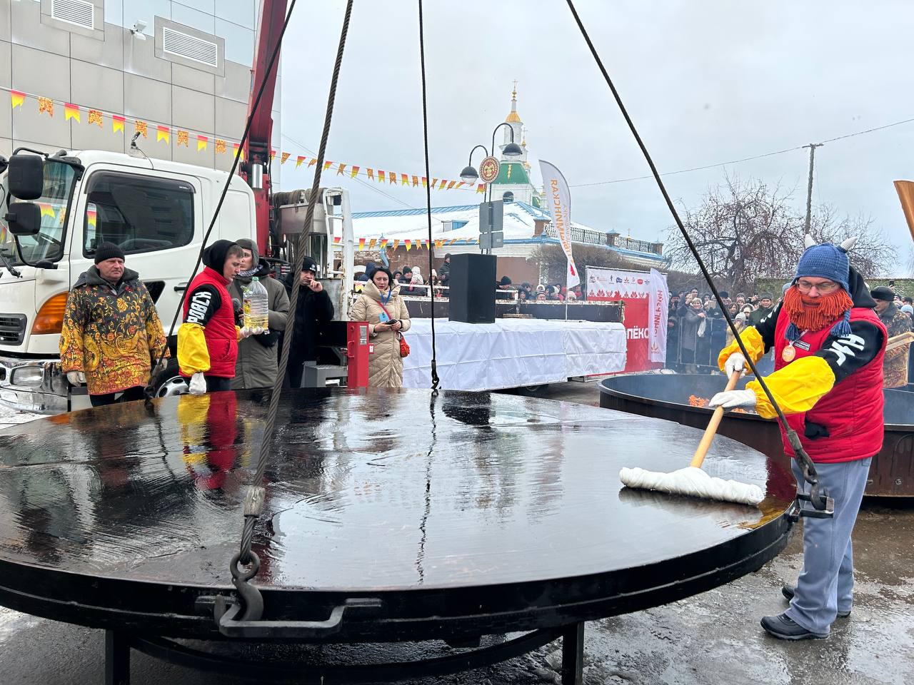 На этом моменте стоит вспомнить, что технология переворачивания гигантских блинов вырабатывалась долго и сложно, а потом отрабатывалась годами! Первый блин на гигантской сковородке пекли в 2007 году — тогда он получился комом. Пробовали использовать огромные лопаты, железные щиты — и в итоге придумали огромную скалку. Впервые блин без серьезных потерь смогли перевернуть в 2020-м, и только в 2022-м пришли к идеальному результату.