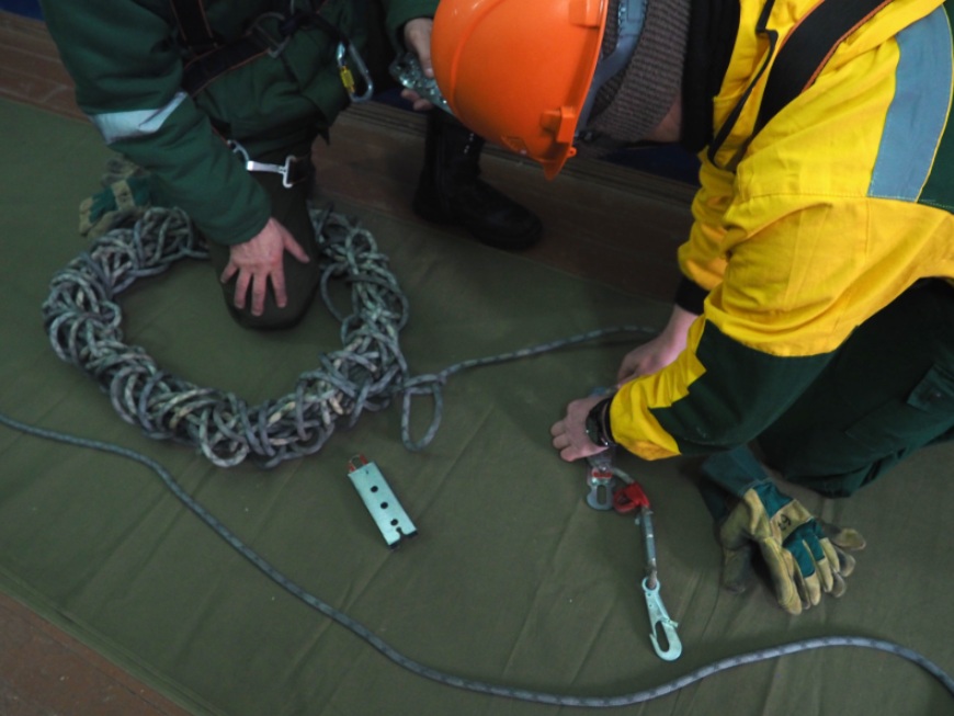Однако спуск — лишь часть работы. Следующий этап тренировки проходил уже в помещении базы. Под присмотром дежурного по укладке участники проверили индивидуальные спусковые устройства, которые настраиваются индивидуально, и правильно уложили шнур в скатку. Затем — снова на вышку. И так несколько раз.