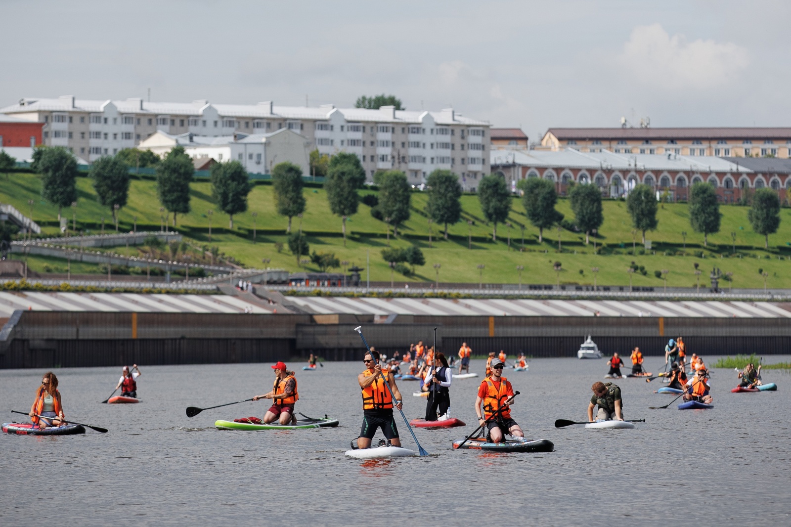 Сто двадцать человек на ста двадцати сапбордах! Заплыв стартовал из Заречного парка и протянулся до «Конторы пароходства». Без малого четыре километра по воде. Это расстояние участники преодолели за полтора часа.