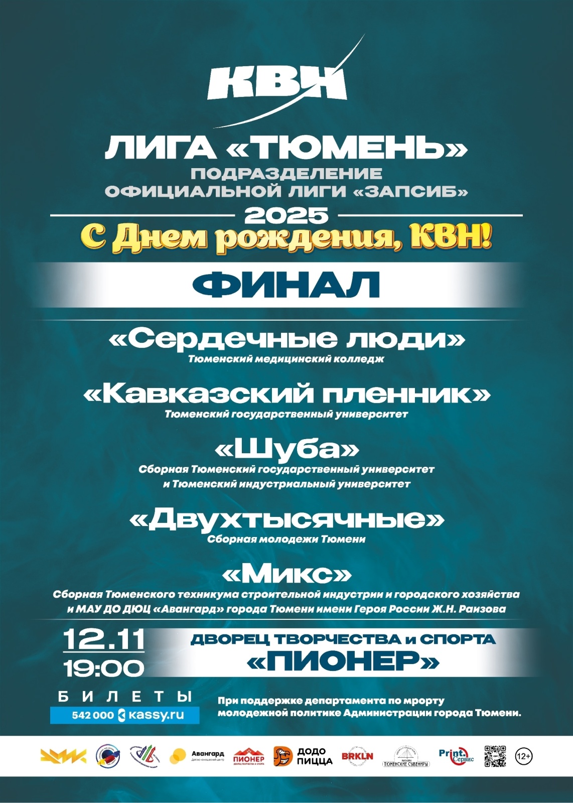За этот титул поборются пять команд: «Кавказский Пленник» (Тюменский государственный университет), «Шуба» (сборная ТюмГУ и Тюменского индустриального университета), «Двухтысячные» (сборная молодежи Тюмени), «Сердечные люди» (Тюменский медицинский колледж), «Микс» (сборная ДЮЦ «Авангард» и Тюменского техникума строительной индустрии и городского хозяйства (ТТСИ и ГХ).