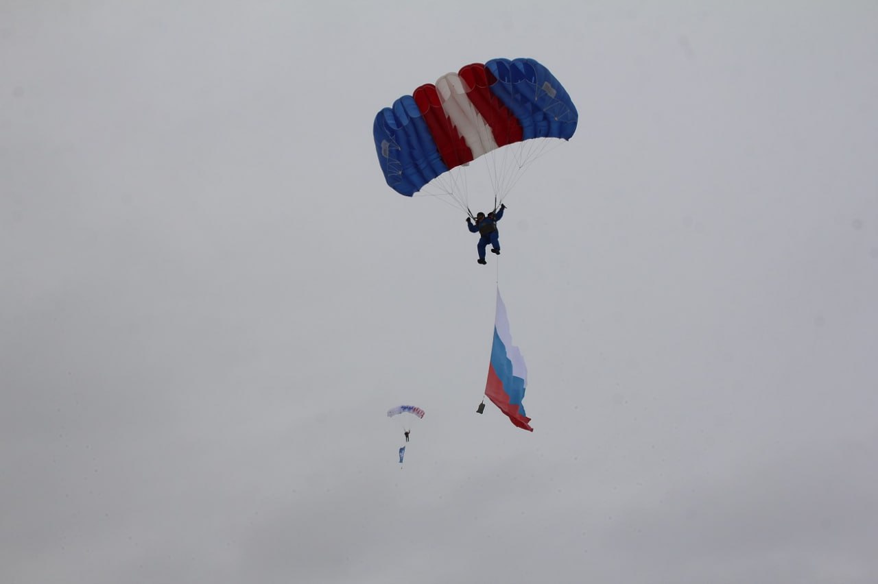 Вертолет типа Ми-8МТВ произвел массовый десант парашютистов федерации парашютного спорта Тюменской области, а также выполнил демонстрационный полет над набережной. Среди парашютистов, участвующих в показательных прыжках, — представители сборной команды России по парашютному спорту, тандем-инструкторы, мастера спорта международного класса, профессиональные спасатели, чемпионы мира в командном зачёте.