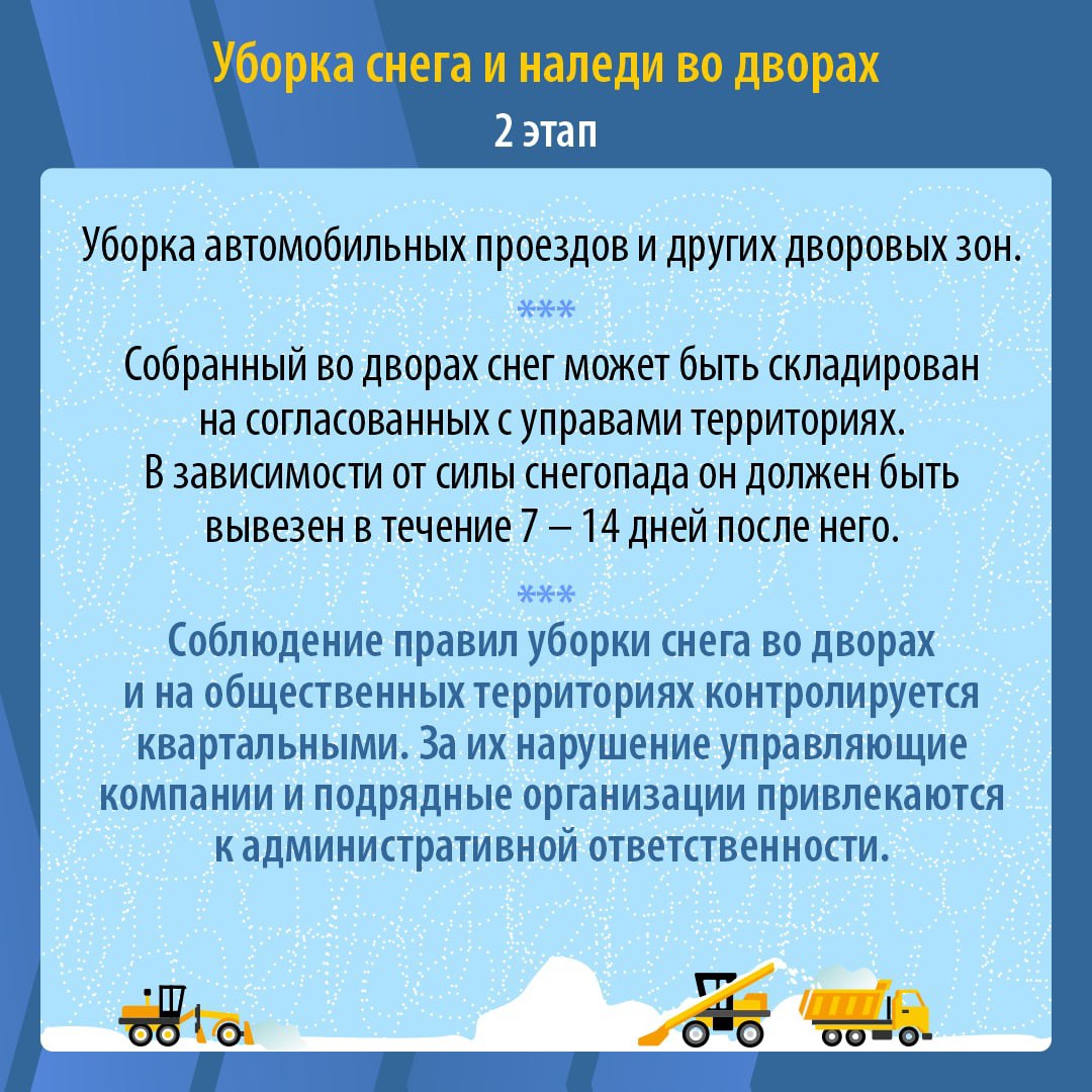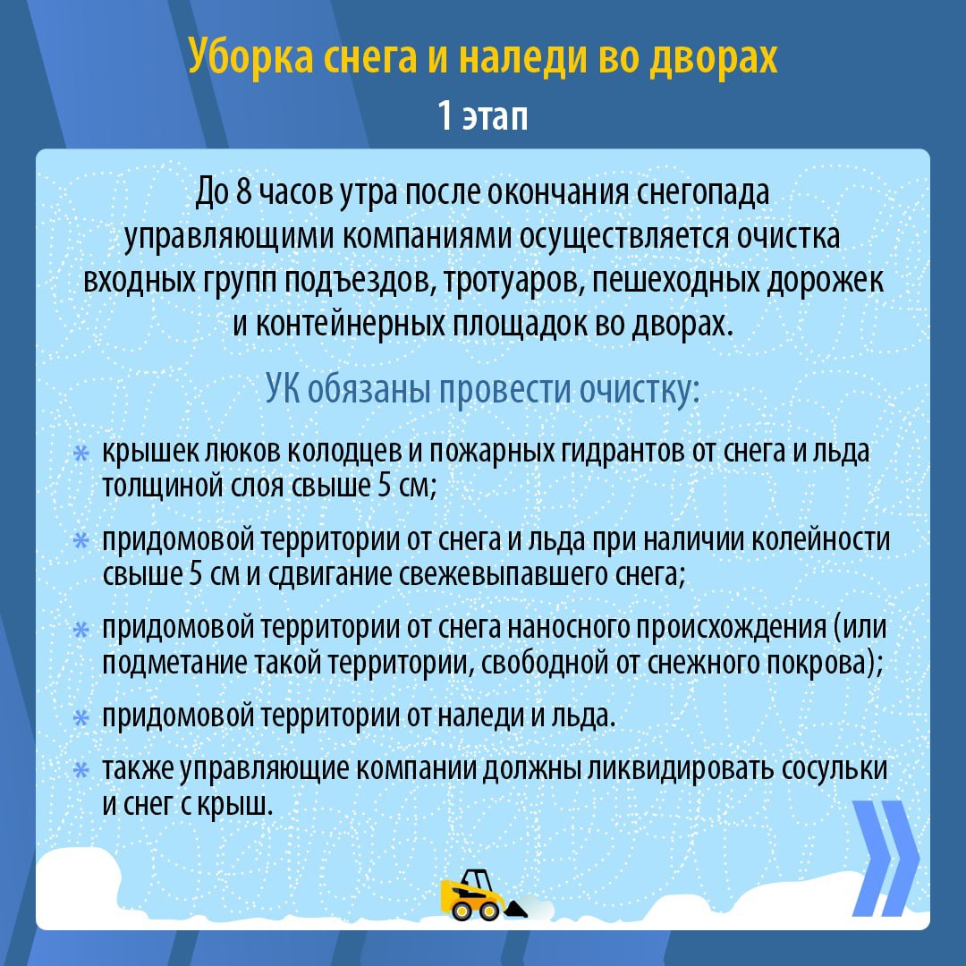 Управляющие компании, ТСЖ и ТСН активно наводят порядок на придомовых территориях. В первую очередь дворники и их помощники вручную расчищают входные группы, самые проходные тротуары, подходы и подъезды к контейнерным площадкам. Для финального, чистового результата привлекается техника. Снежные кучи должны быть вывезены в течение 7-14 дней после снегопада, исходя из его интенсивности.