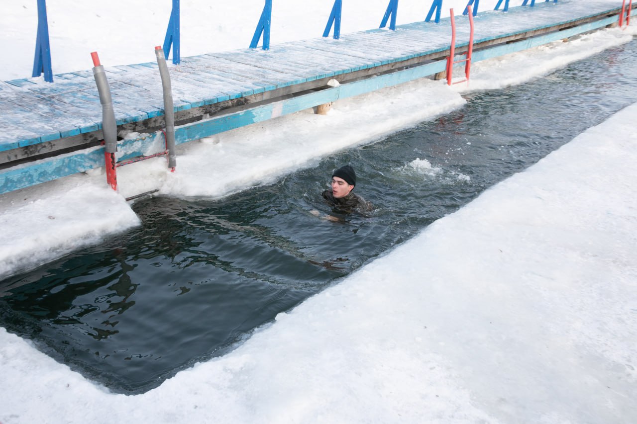 Помимо военной подготовки курсанты активно занимаются физкультурой и спортом. На территории училища подготовлена прорубь, в которой молодые люди выполняют сложные задачи в ледяной воде. Напомним, что в декабре курсанты ТВВИКУ и тюменские моржи установили рекорд России по зимнему плаванию в бронежилетах.