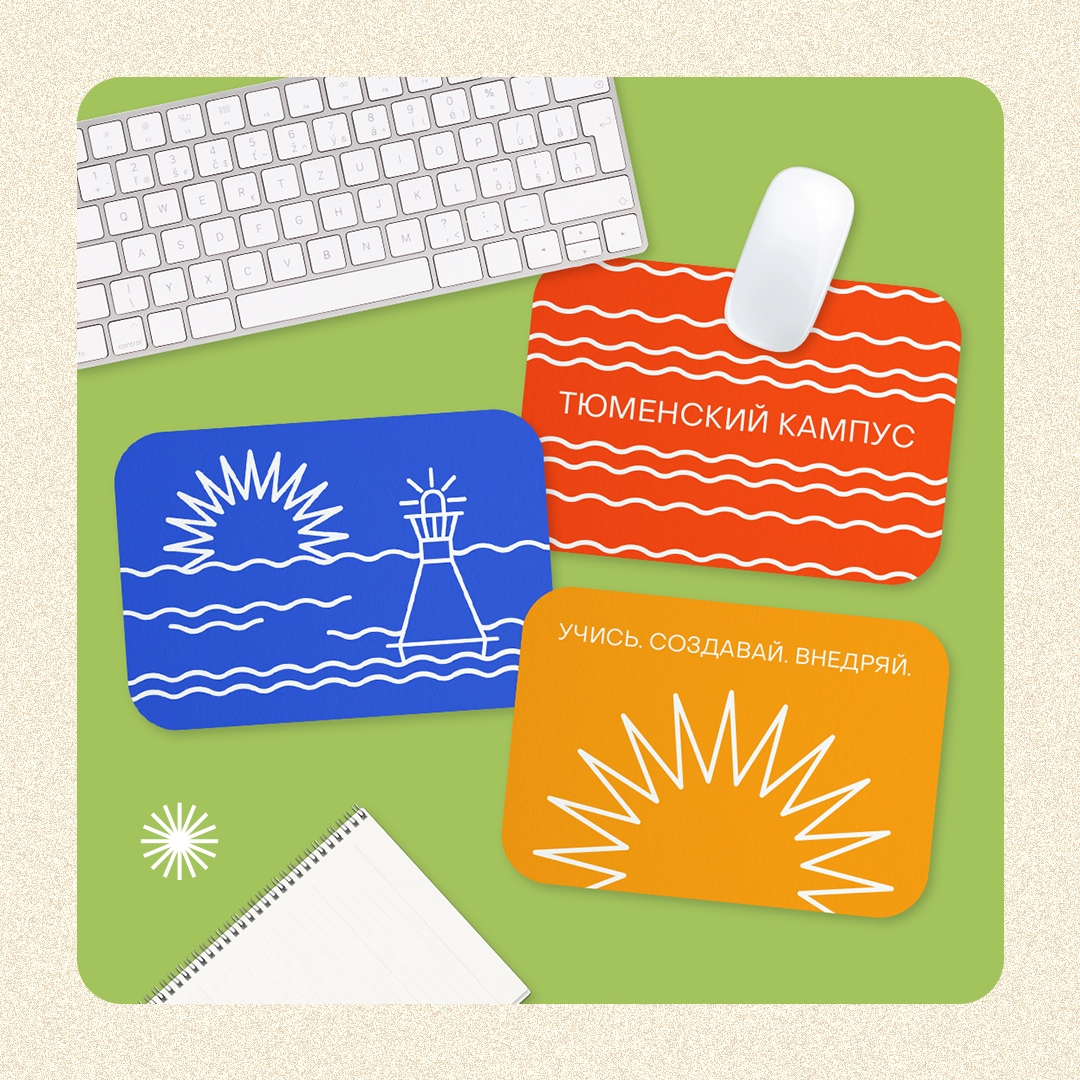 В опубликованном в официальном паблике «Медиацентр | Тюмень» посте команда представила макеты сувенирной продукции, демонстрирующие воплощение внешнего оформления. Среди них — толстовка с надписью «В движении — сила», картхолдер «Мой курс — на результат», брелок «Знания в дело», коврики для компьютерной мыши с надписями «Тюменский кампус» и «Учись. Создавай. Внедряй», а также значки с изображением буя и других визуальных элементов.
