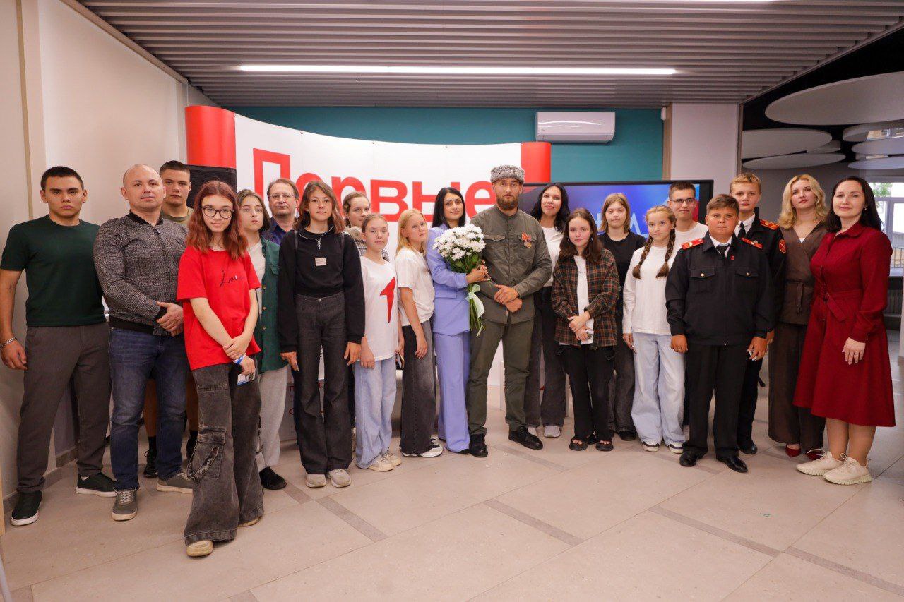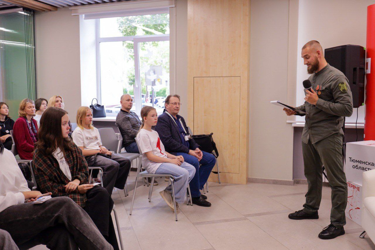 В региональном штабе «Движения Первых» перед молодыми людьми выступил ветеран Владислав Вершинин. Он руководит спортивно-патриотическим клубом «Ермак» и тренирует армейскому рукопашному бою. Владислав поделился с ребятами историями своей жизни, боевого опыта, ответил на все интересующие вопросы и исполнил для них песню собственного сочинения «Над Донбассом».