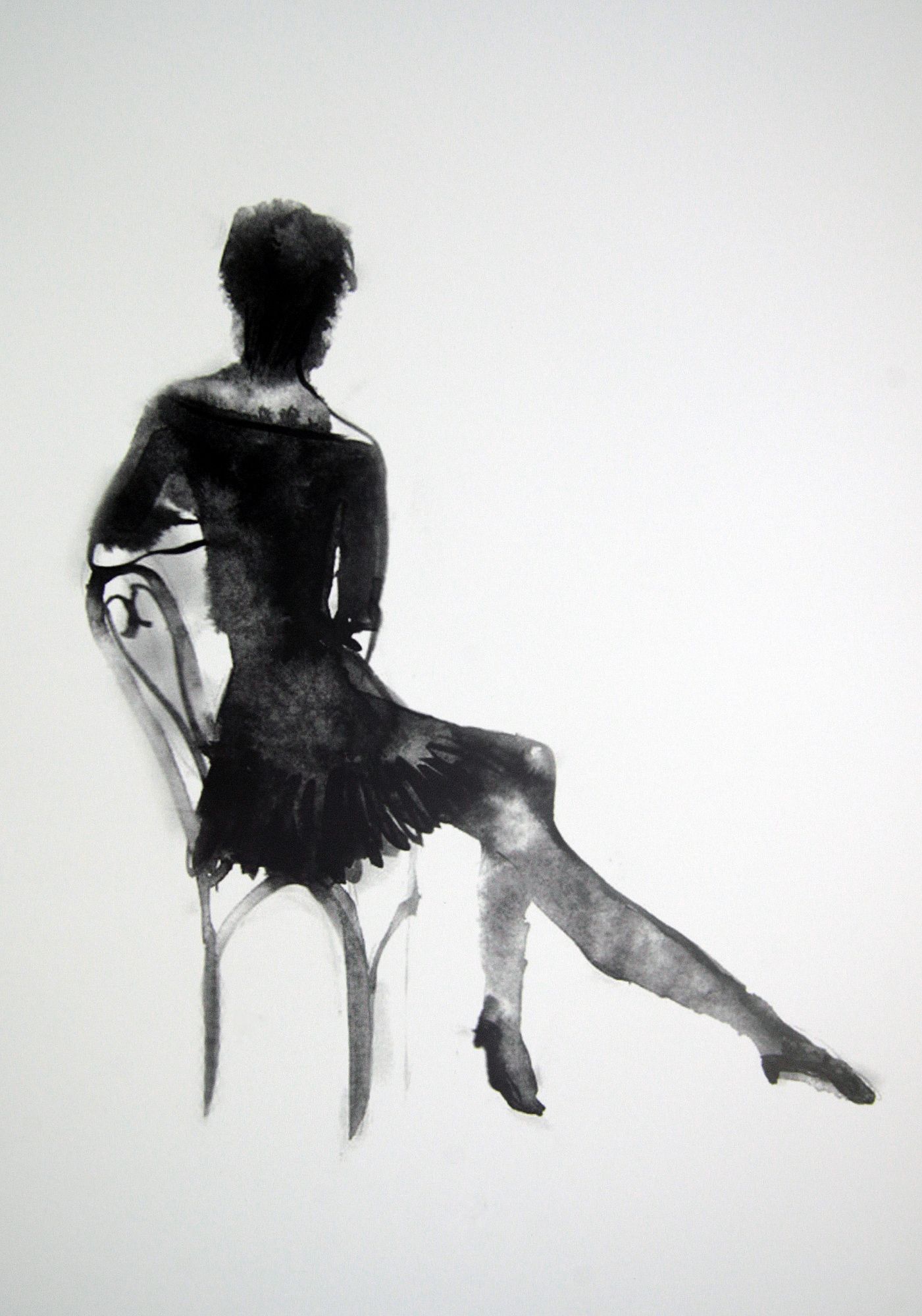В череде живописных работ особо выделяются две серии монохромных набросков. В одну из них вылилась серия зимних вечеров пару лет назад, которые коротала с подругой Машей Татьяна Гамзина. Спонтанные черные мазки складываются в фигуру девушки, сидящей на краешке стула, танцующей. При нарочитой густоте красочного черного слоя набросок не дает ощущения мрачности. Напротив, запечатленная, практически не остановившаяся в танце героиня не кажется ни мрачной, ни одинокой. Вот они, оттенки.