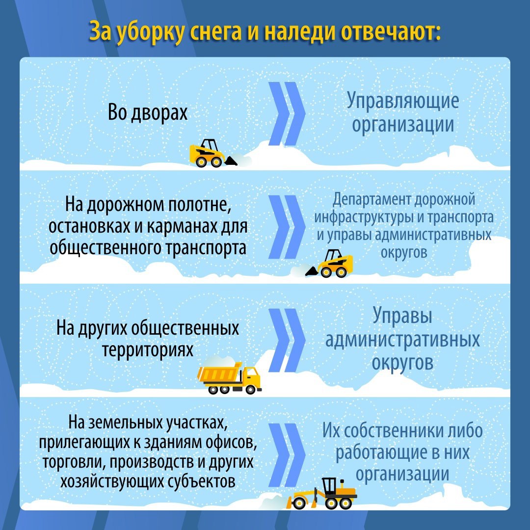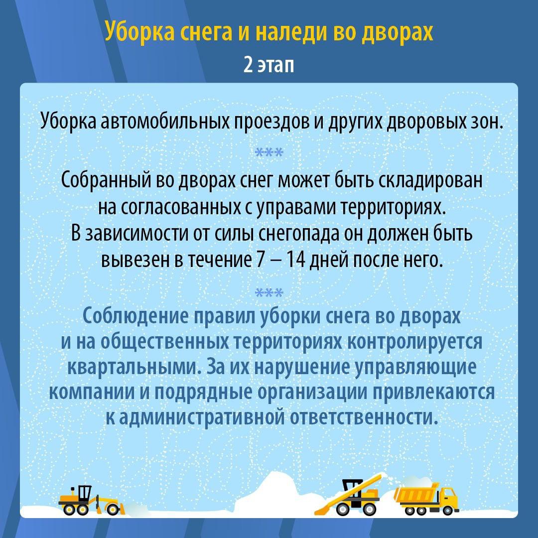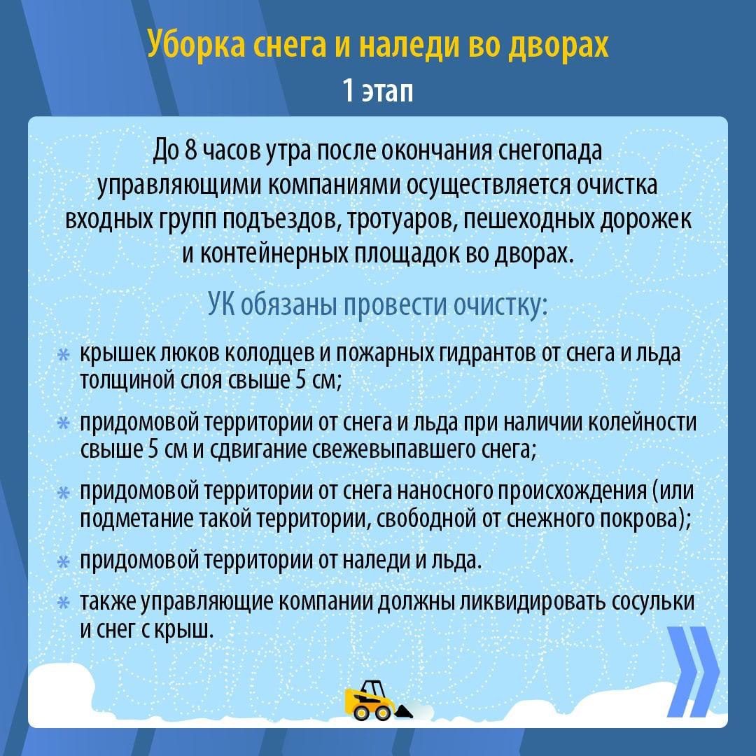За поддержание чистоты на придомовых территориях и, соответственно, за уборку снега несут ответственность управляющие компании. В приоритете очистка входных зон, тротуаров с высокой проходимостью, подходов к мусорным контейнерам и подъездам, а также дорожек, ведущих к остановкам общественного транспорта. Их очистка должна быть выполнена в течение восьми чесов после снегопада.