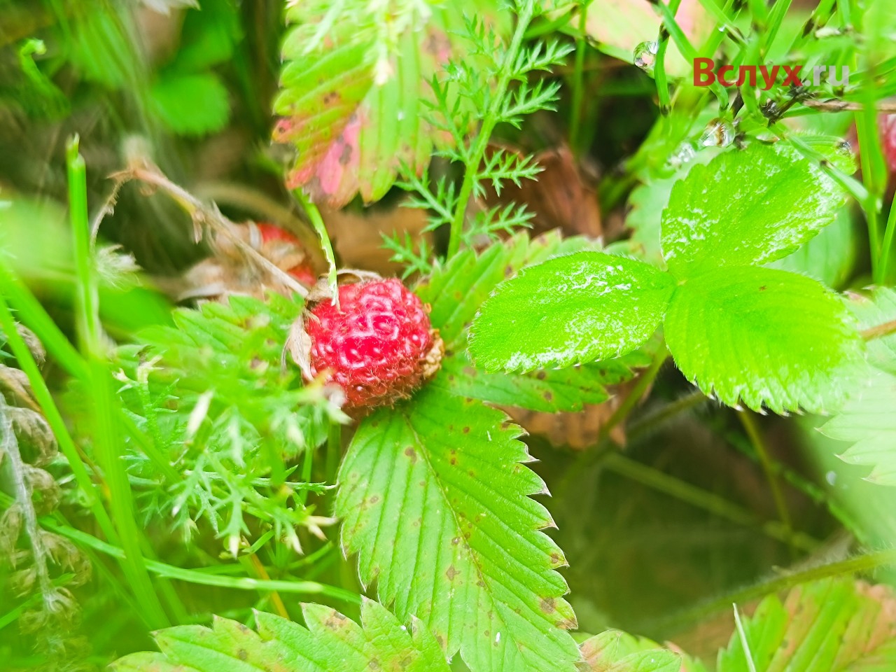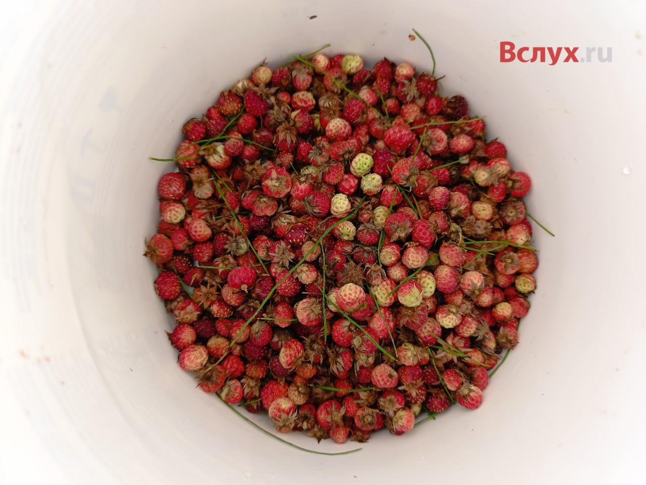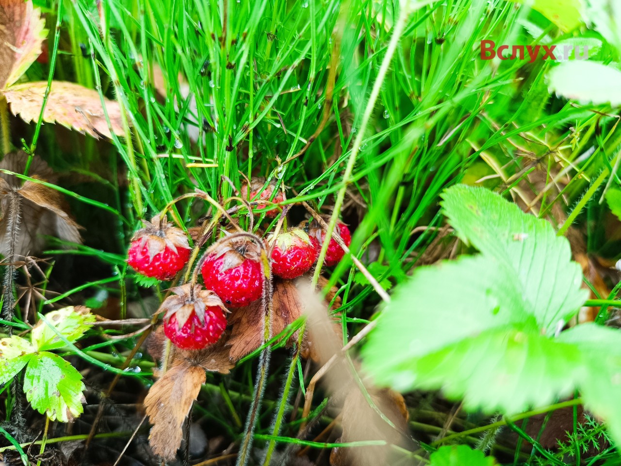 Перед нами большая поляна, заросшая густой травой. С виду не скажешь, что здесь растет клубника. Присмотревшись, начинаю замечать характерные для клубники или земляники листочки. Только ягод не видать. Вообще! Оказывается, все ягоды прячутся под листьями. Разводишь их руками, и вот она — перед тобой! В отличие от земляники ягоды круглые, но такие же мелкие, зато на веточках свисают гроздьями. Крупных мало. Еще больше расстроило то, что мало красных ягод, в основном белобокие, либо уже перезрелые и с плесенью. Местный житель подсказал — брать и красную и ту, которая только начала краснеть и даже белую. Иначе бы я и стакана не собрал. По вкусу с земляникой не сравнить! Если земляника с кислинкой даже красная, то лесная клубника очень сладкая. Настоящее лакомство — тает во рту, как варенье. Еще и аромат особенный.