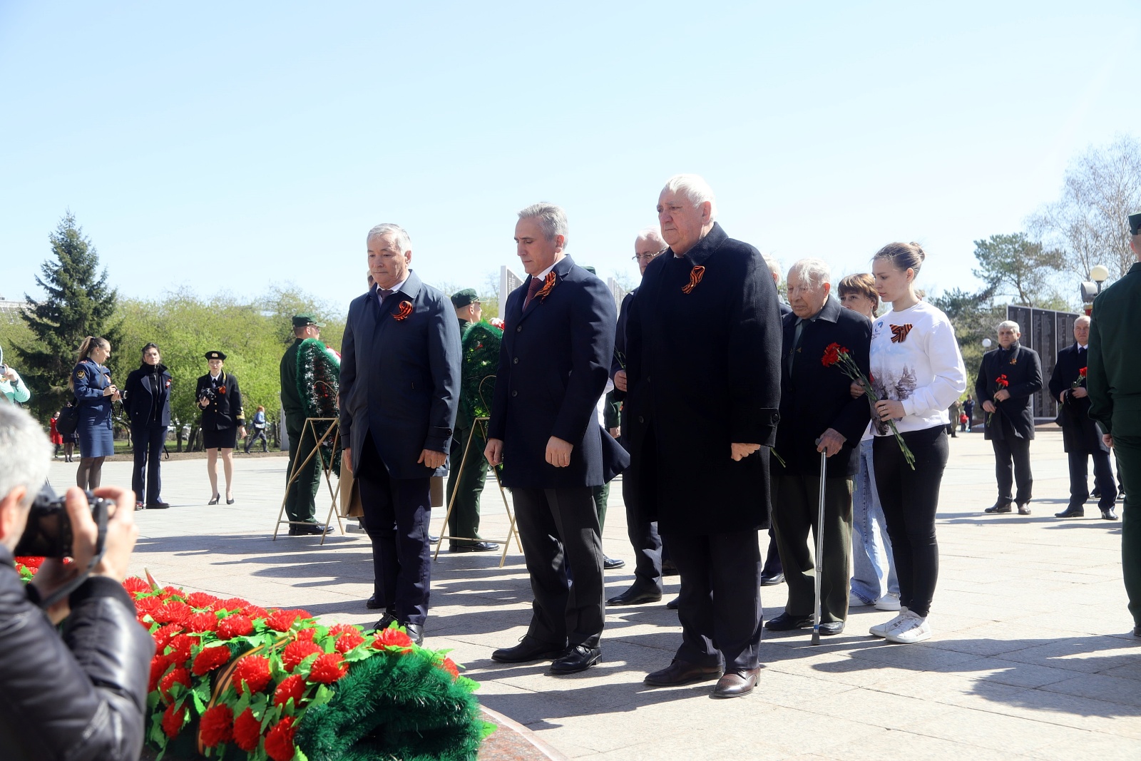 Память воинов, павших в боях Великой Отечественной войны, сражавшихся за мирное небо над нашими головами, почтили первые лица области и города. Губернатор Александр Моор, председатель Областной думы Фуат Сайфитдинов, глава Тюмени Руслан Кухарук, председатель городской думы Светлана Иванова, вице-губернатор Тюменской области Ольга Кузнечевских, заместитель председателя облдумы Наталья Шевчик и другие.