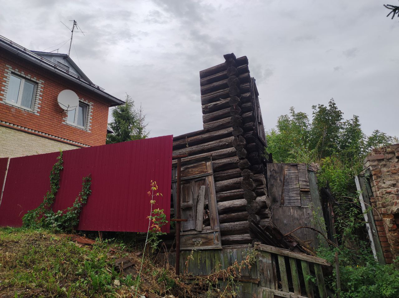 Следующий дом № 15 — новый, но на прилегающем участке сохранилась часть бревенчатой стены и кирпичная противопожарная кладка. И ель, которая по своему великолепию может поспорить с кремлевской новогодней елкой.