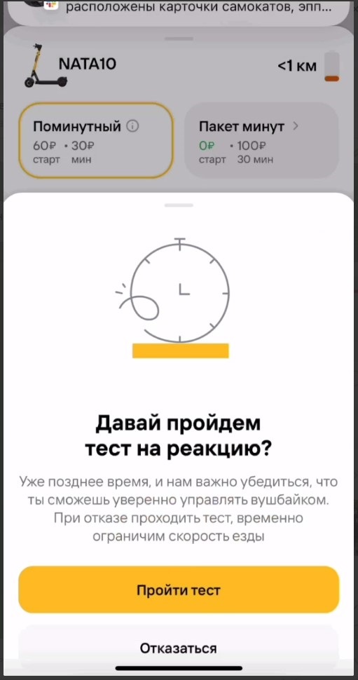 В вечернее время и в определенных локациях — возле баров, кафе, ресторанов самокат может предложить пользователю пройти специальный тест. Он позволит убедиться, что реакция пользователя не заторможена и он может управлять самокатом.