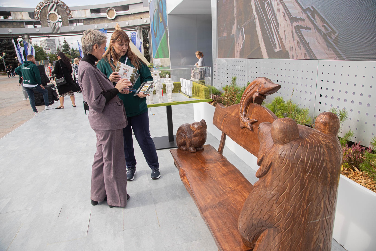 Кстати, в этом году фестиваль деревянной скульптуры не проходил, но на Цветном бульваре стоит скамейка, которую известный в районе мастер Евгений Чагровой создал специально для Дней Уватского района в Тюмени. На ней в уютном соседстве расположились символы Уватской земли — соболь, щука и медведь.