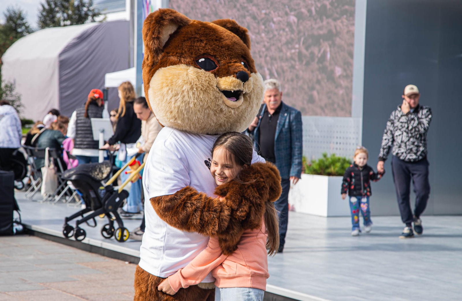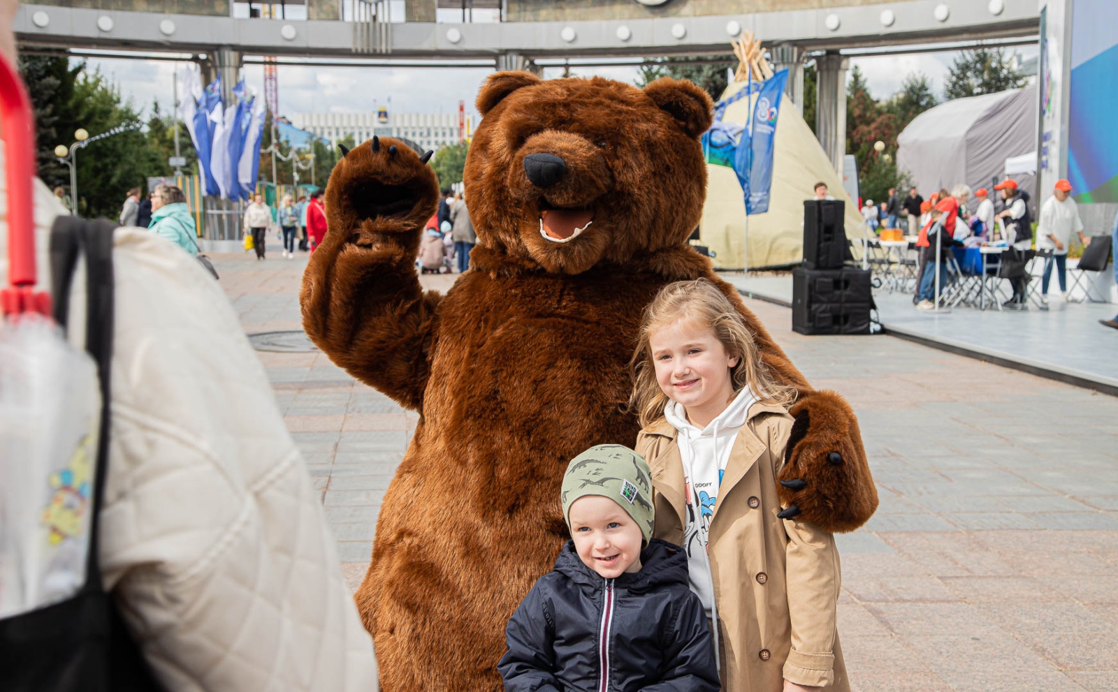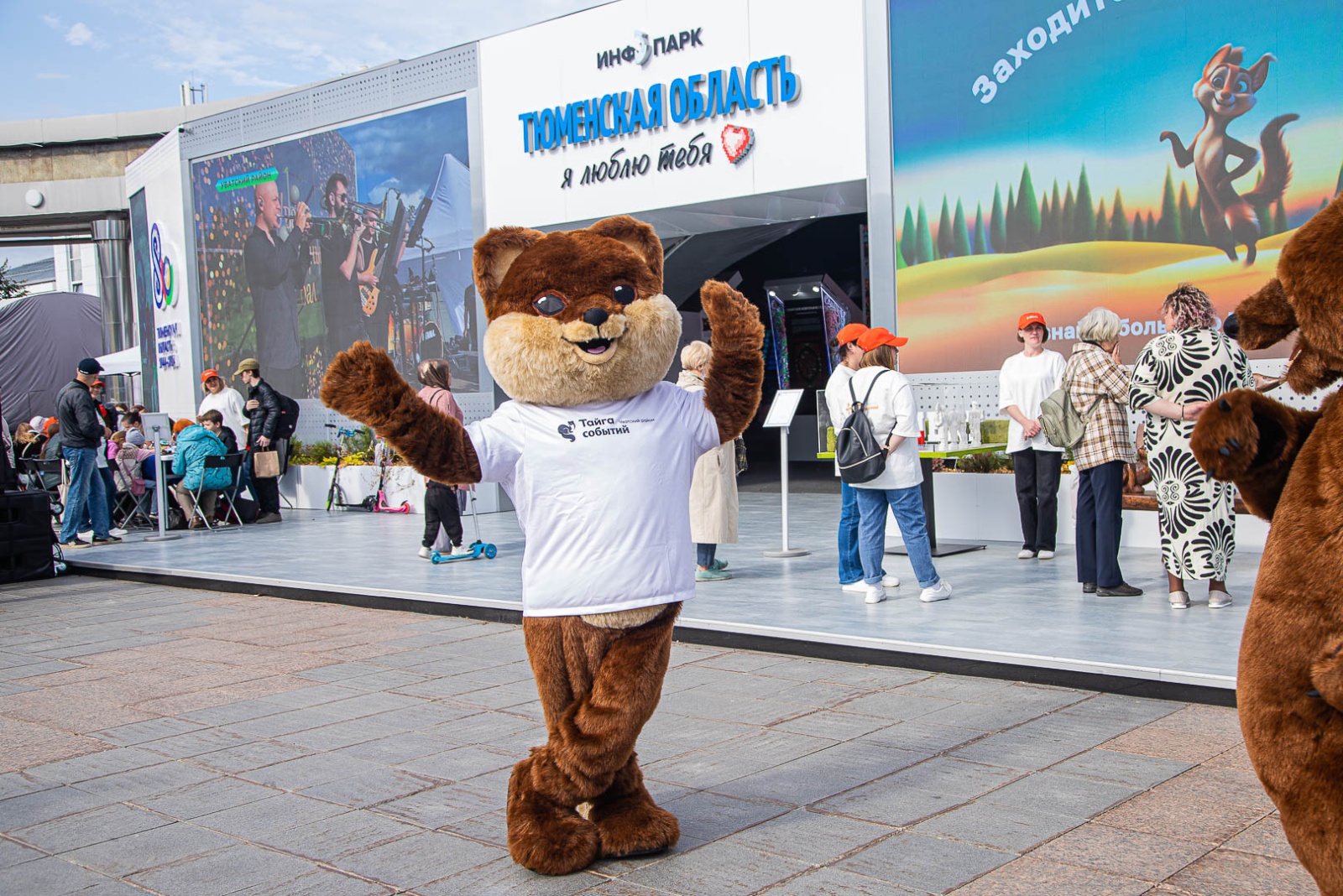 Маскоты соболя и медведя встречают посетителей, обнимаются и фотографируются с ними у входа в инфопарк.