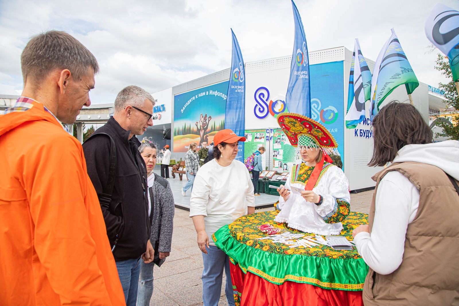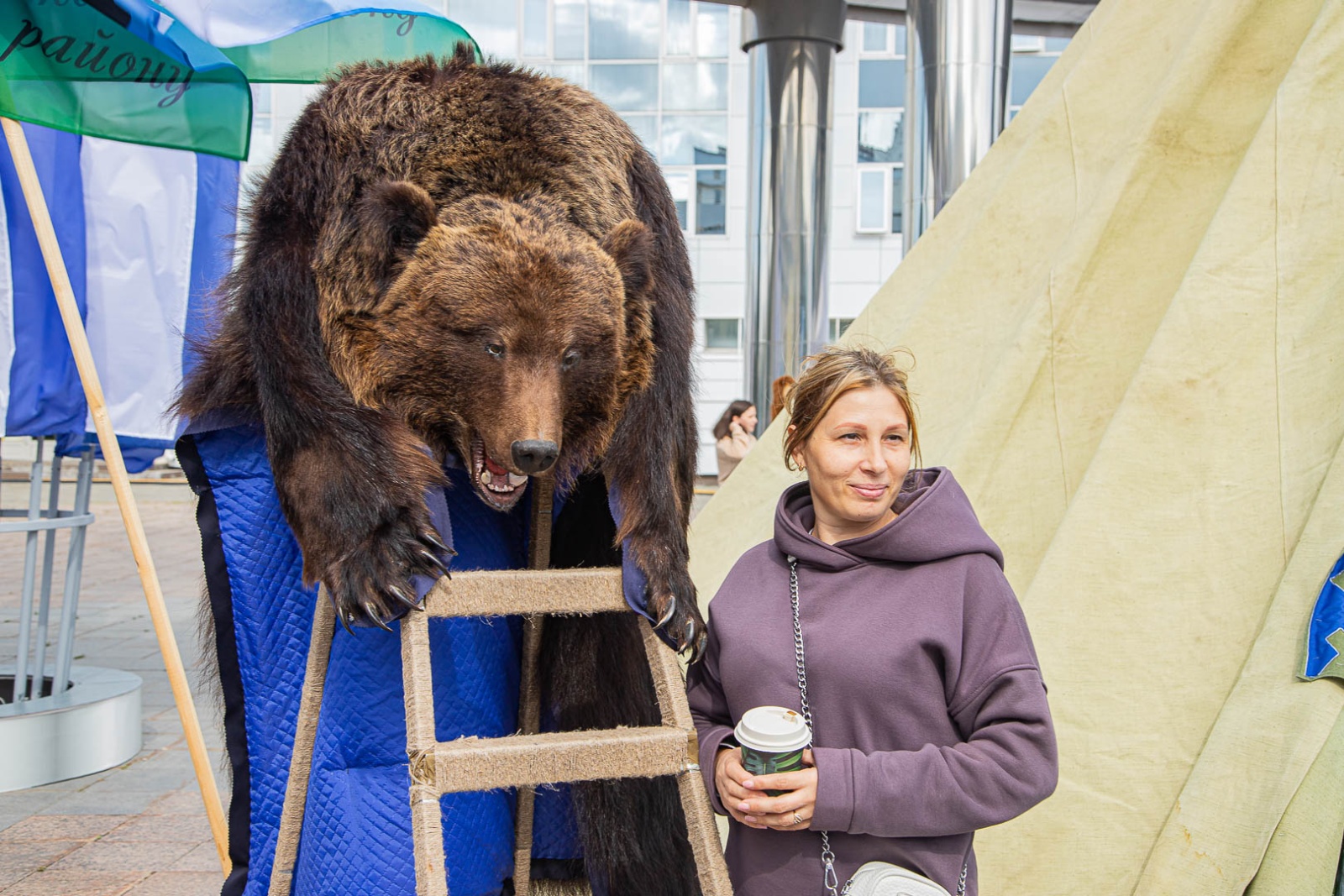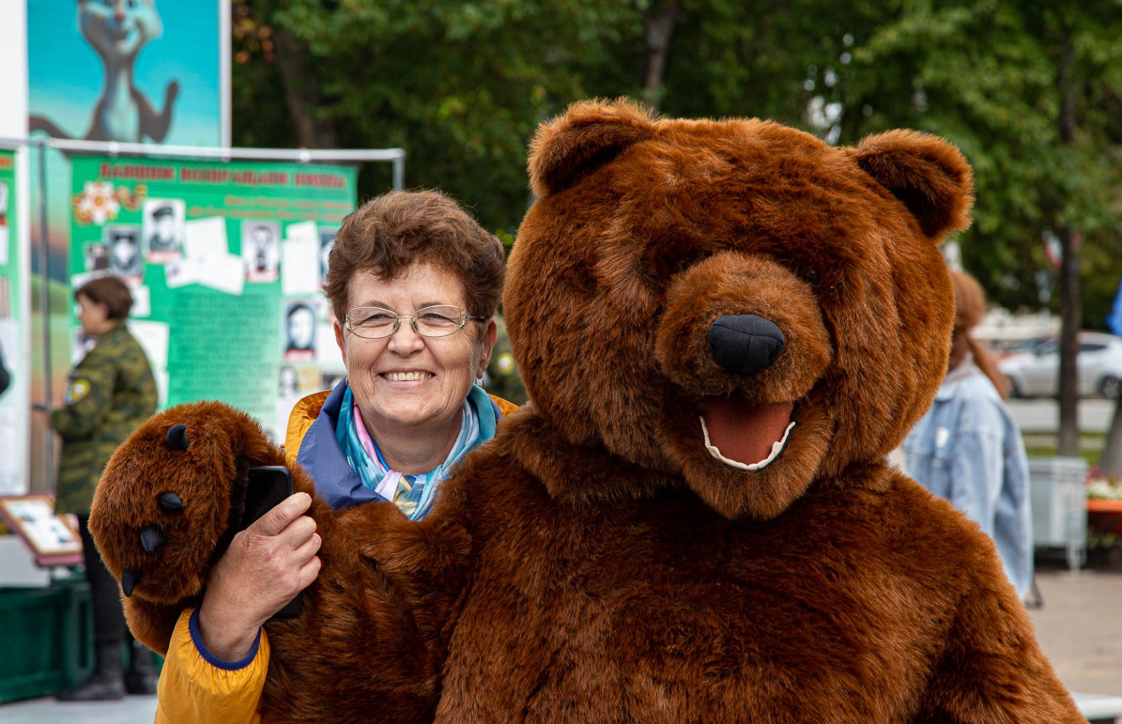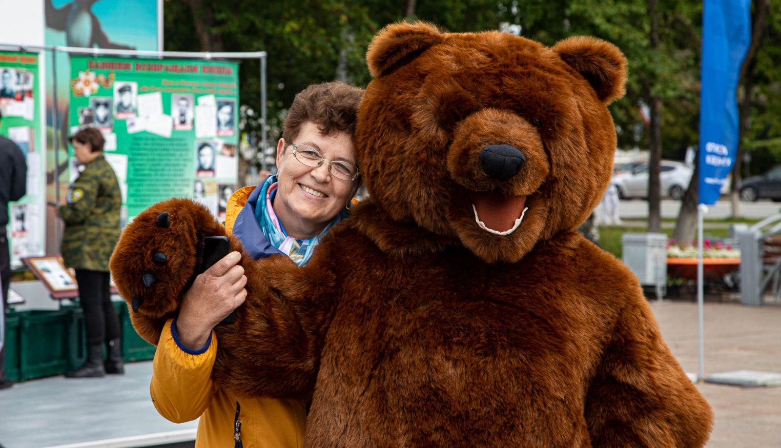 Маскоты соболя и медведя встречают посетителей, обнимаются и фотографируются с ними у входа в инфопарк.