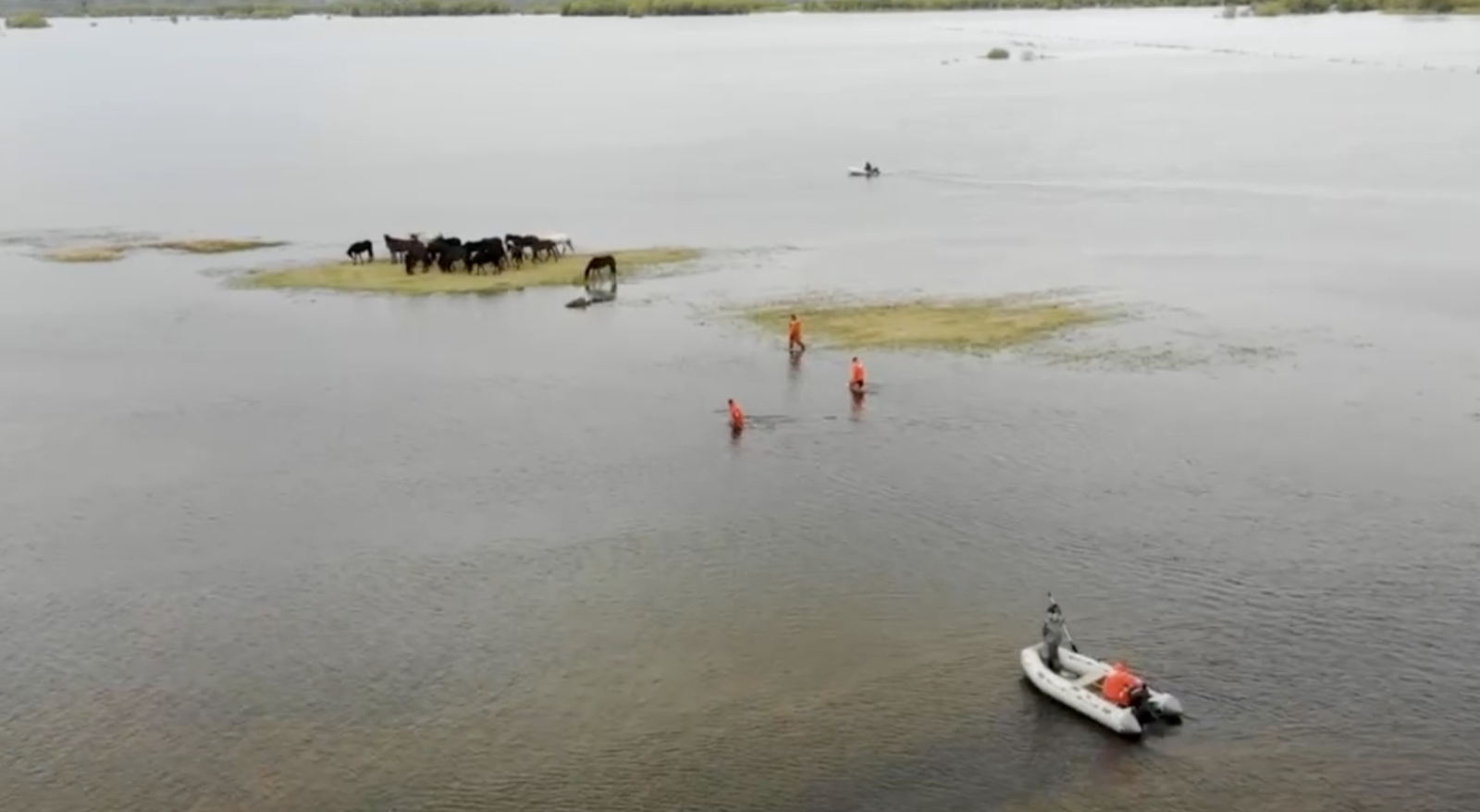 «Из-за резкого подъёма воды в реке Ишим табун лошадей и отара овец оказались отрезанными от большой земли. 41 овцу перевезли с одного берега на другой на лодке. 20 лошадей и одного жеребёнка доставить на большую землю возможности не было, так что их перегнали по воде на сухое безопасное место», — рассказал глава региона.