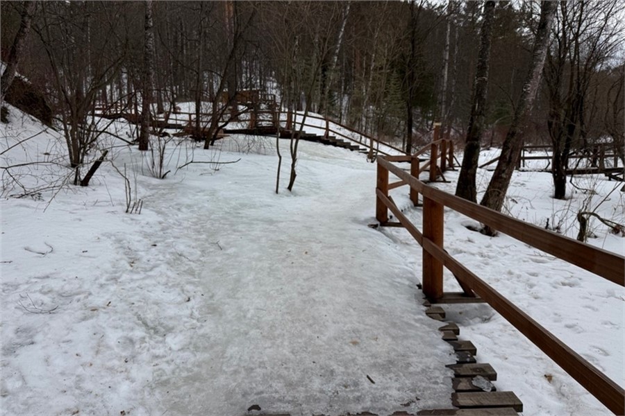 Дороги, тропы и деревянные настилы в национальном парке из-за перепадов температуры покрылись льдом. Стало очень скользко.