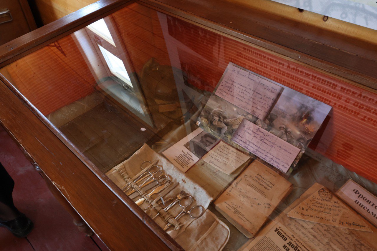 В вагоне Памяти представлена выставка, посвященная подвигу тоболяков, которые внесли вклад в Победу. В ее формировании помогали медицинский колледж им. В. Солдатова, школа №1, школа №14, школа №15.