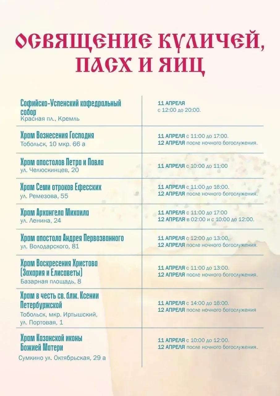 В субботу, 11 апреля, богослужения пройдут в 10 храмах Тобольска — включая отдаленные микрорайоны. Днем — освящение куличей, а ночные службы начнутся с 23:00.