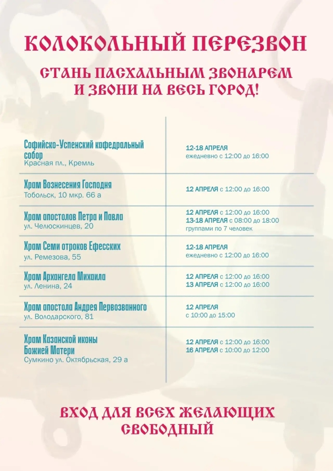 «Все дни фестиваля, с 5 по 20 апреля, тоболяков и гостей города ждет большая программа: свободный подъем на колокольни, мастер-классы, в кафе — авторские десерты, — прокомментировал Петр Вагин. — Отдельно — о безопасности. Наша задача — чтобы праздник прошел светло и спокойно для каждого».