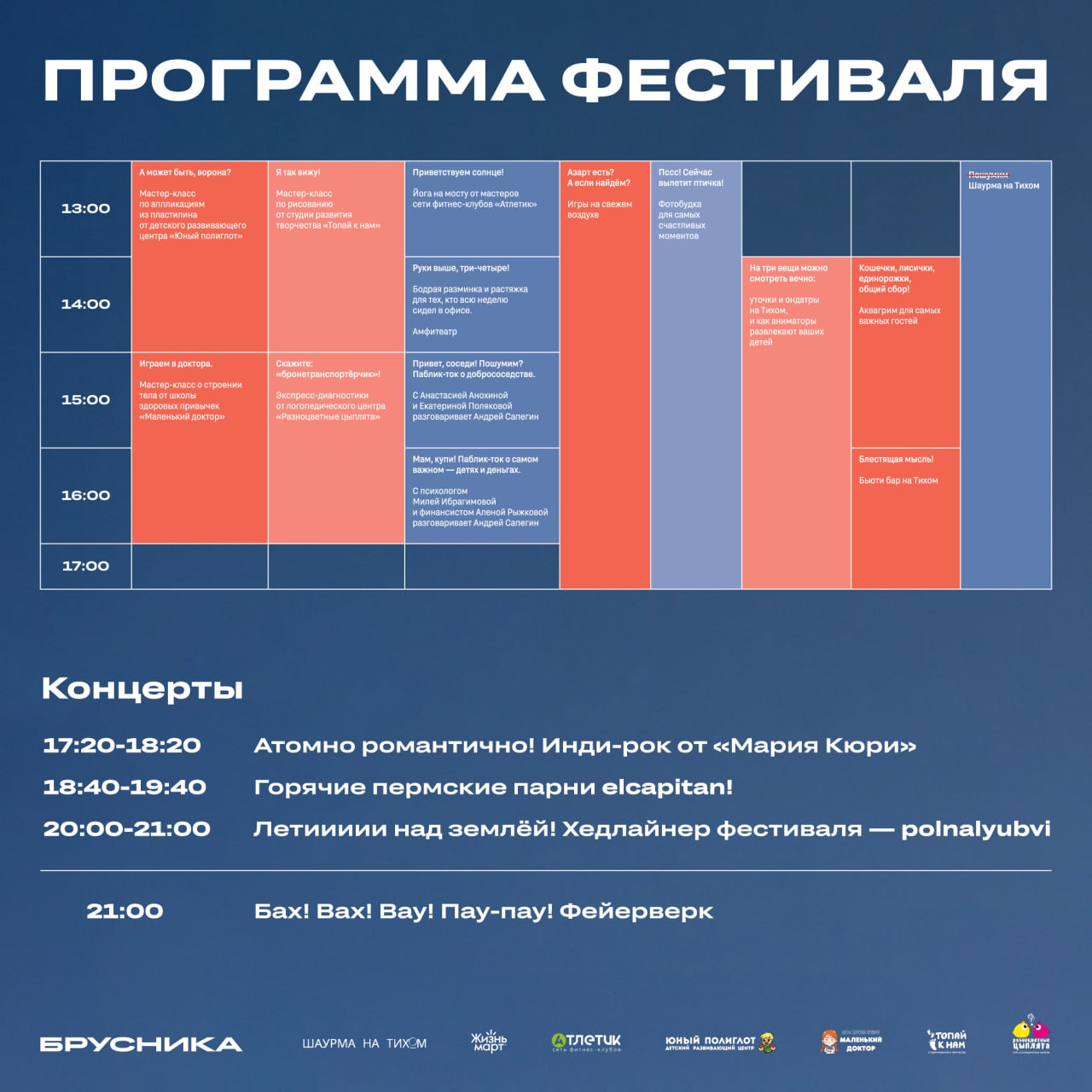 Вечером гостей ждет музыкальная программа. В 17.20 начнется выступление группы «Мария Кюри». В 18.40 на сцену выйдут горячие пермские парни еlcapitan. В 20.00 — хедлайнер фестиваля polnalyubvi.