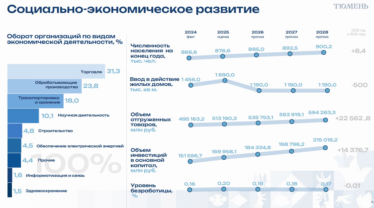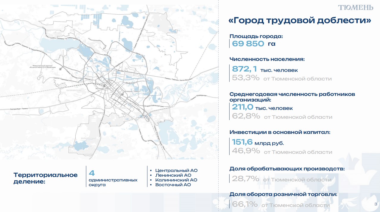 Также, по данным администрации, в Тюмени проживает 53,3% населения юга Тюменской области, трудятся 62,8% работников региона.