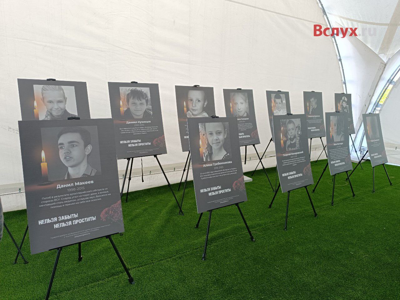 Свою экспозицию представила «Молодая гвардия». В шатре выставлены фотографии погибших детей на Донбассе. В Екатеринбурге на такой же выставке посетители несли к портретам живые цветы.