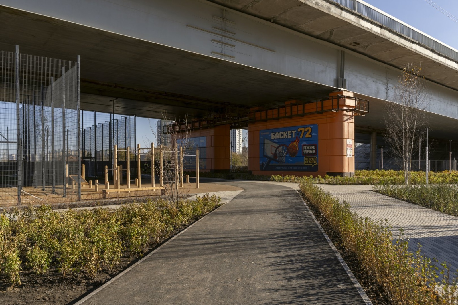 Под мостом появилась спортивная инфраструктура: поле для мини-футбола, площадка для баскетбола, зона воркаута. В дневные часы спортивные объекты открыты для всех желающих.